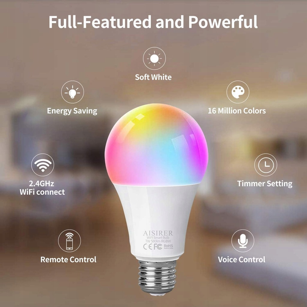 Inteligentna żarówka AISIIRE jest kompatybilna z darmowymi inteligentnymi aplikacjami - Smart Life, Ahome, Tuya, efamilyCloud, IFTTT, Google Home.