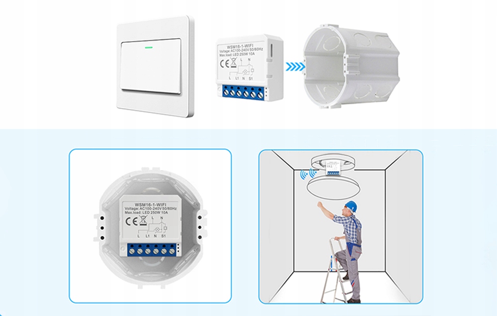 Dzięki kompaktowej konstrukcji model WSM16-W3 jest kompatybilny z różnymi rodzajami przełączników i pasuje do nawet 95% puszek instalacyjnych dostępnych na rynku. Możesz też przymocować go do lampy. Jego montaż nie sprawi Ci żadnego problemu ani nie zajmie zbyt wiele czasu. Co więcej, istnieje możliwość wykorzystania 2 przełączników do obsługi jednej lampy – takie rozwiązanie sprawdzi się na przykład w pobliżu schodów. Dzięki temu wygodnie zapalisz światło na parterze, a zgasisz je po wejściu na piętro!