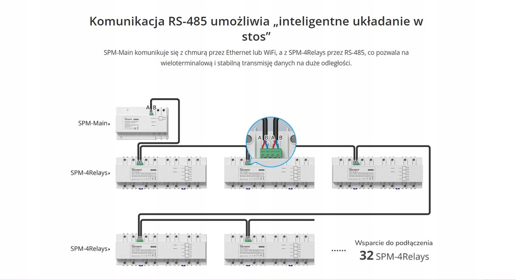 - Połączenie z przełącznikami SPM-4Relay odbywa się poprzez port RS-485, dzięki czemu zapewnia stabilną transmisję na duże odległości.
