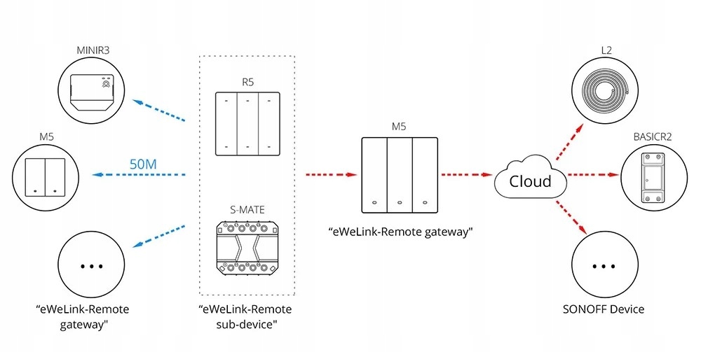 Urządzenia z funkcją eWeLink-Remote pracują i komunikują się bezpośrednio poza WiFi. M5 jako "bramka" przekazuje odpowiednie statusu do aplikacji.