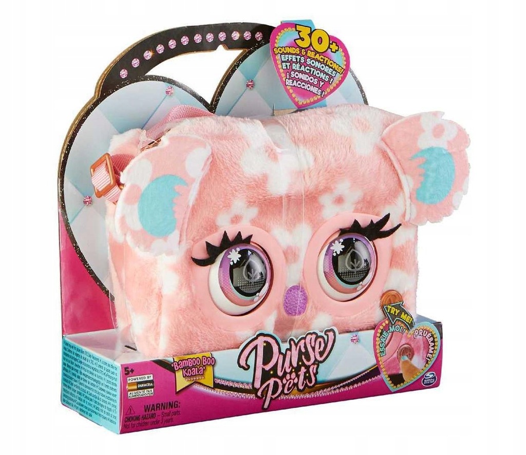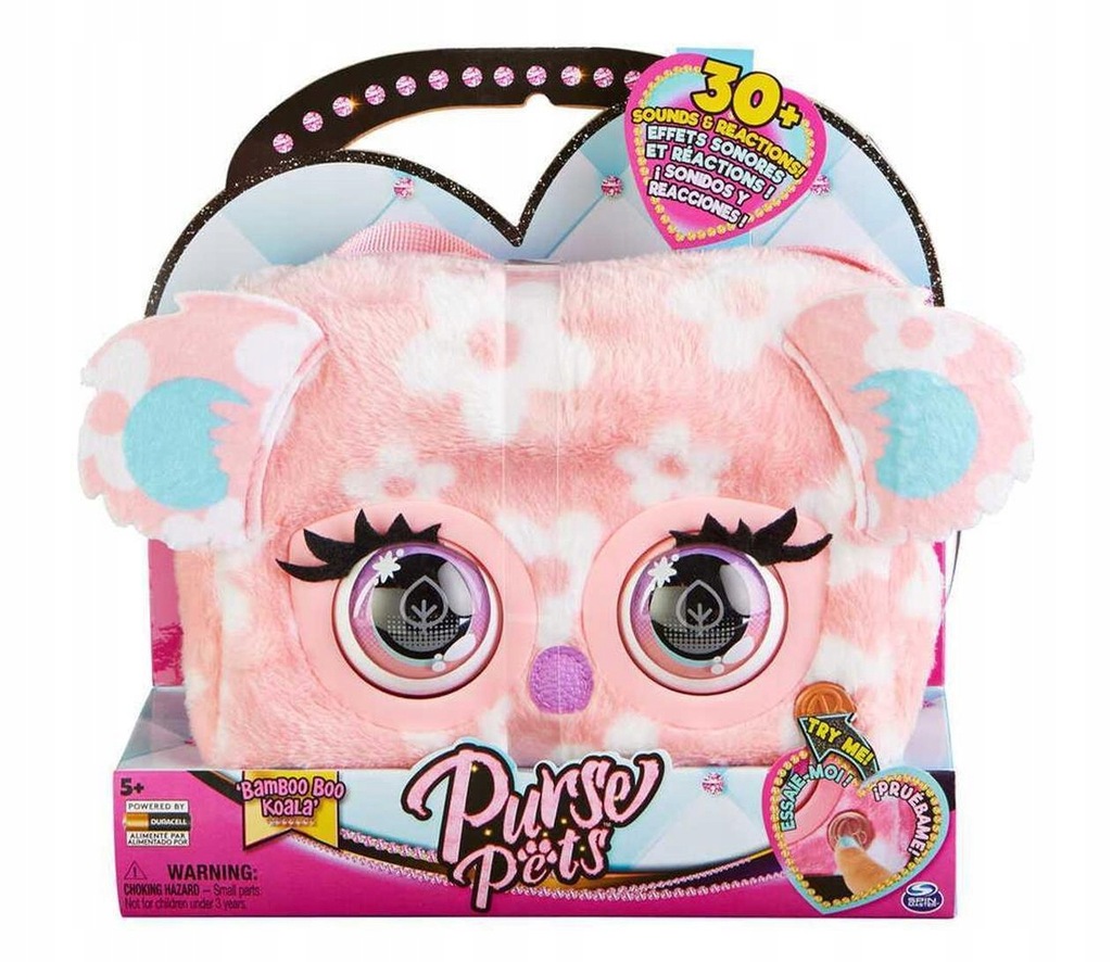 Nowe wspaniałe torebki Purse Pets mają swoją osobowość! Odpowiadają na twój dotyk, mrugają oraz wydaja ponad 30 dźwięków i reakcji! Koala ma mięciutkie pluszowe futerko z kwiatkami, a Sowa cudowne skrzydła i brokatowe detale. Torebki mają regulowaną długość paska i oczy inspirowane pop-artem! Dotknij czoła torebki, a usłyszysz słodkie dźwięki i interacje Purse Pets. Jesli przytrzymasz dłoń na czole, to torebka zacznie mrugać i prześle ci całusa. Każda torebka ma także magiczny przycisk, dzięki któremu możesz odkryć jeszcze więcej możliwości gier! Purse Pets odpowie na pytanie TAK/NIE, zagra wybiegową muzykę lub włączy dźwięk aparatu i oklasków publiczności. Skompletuj torebki Purse Pets i twórz niezwykłe stylizacje!