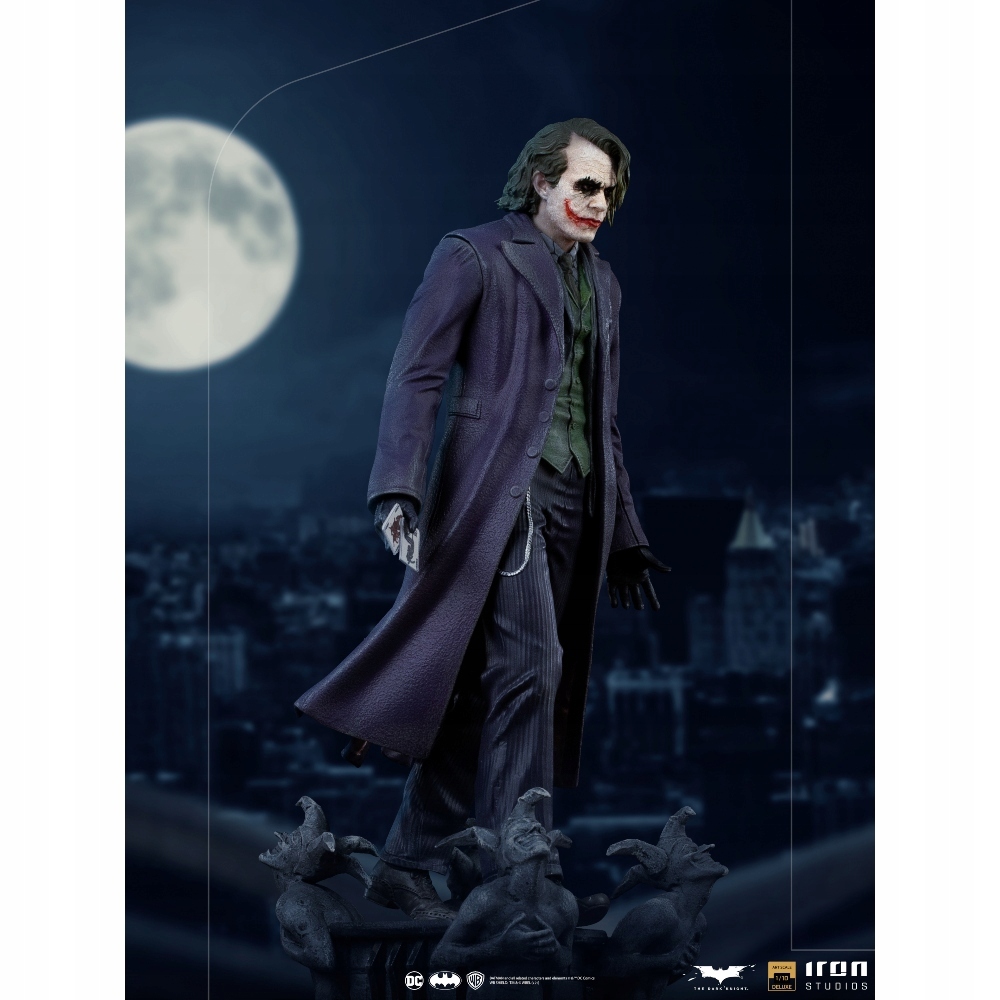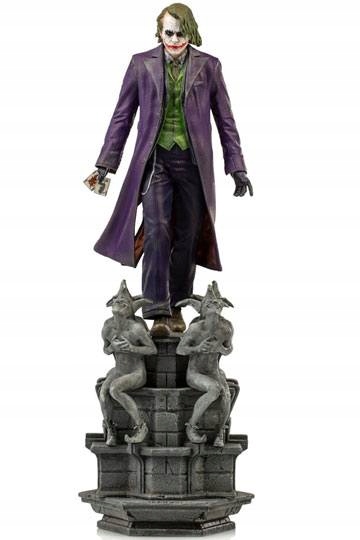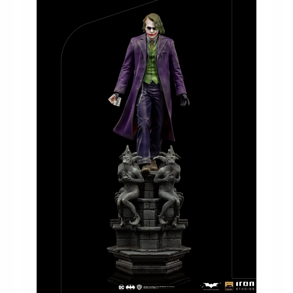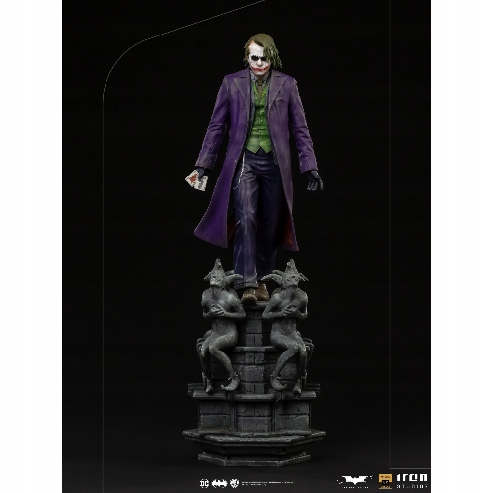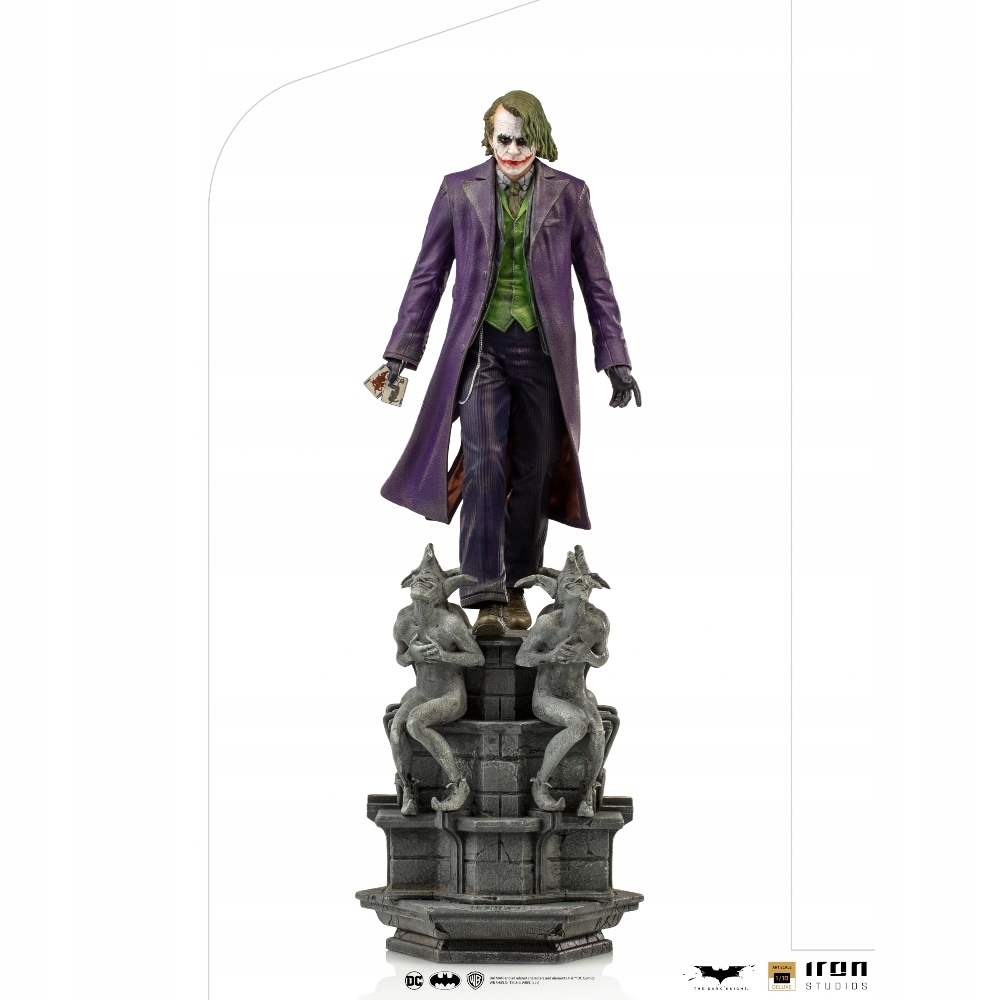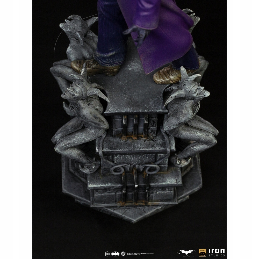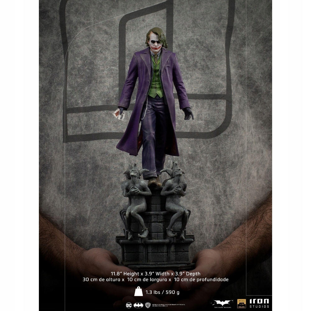 Na szczycie betonowego słupa totemowego, ozdobionego wokół niego rzeźbami średniowiecznych bufonów, będących symbolami kart do gry, które zainspirowały jego imię, najbardziej przerażający złoczyńca Gotham pozuje na tej podstawie ubrany w swój formalny purpurowy strój i przynoszący w jednej z rąk swoją kartę prezentacyjną w postaci kart do gry, które mówią jego imię. Iron Studios z dumą przedstawia jedną z najbardziej pożądanych przez fanów i kolekcjonerów figurek chaotycznego czarnego klauna, \"The Joker Statue - Batman The Dark Knight - Art Scale 1/10 - Iron Studio \", w jednym z jego najbardziej uderzających i emblematycznych przedstawień.