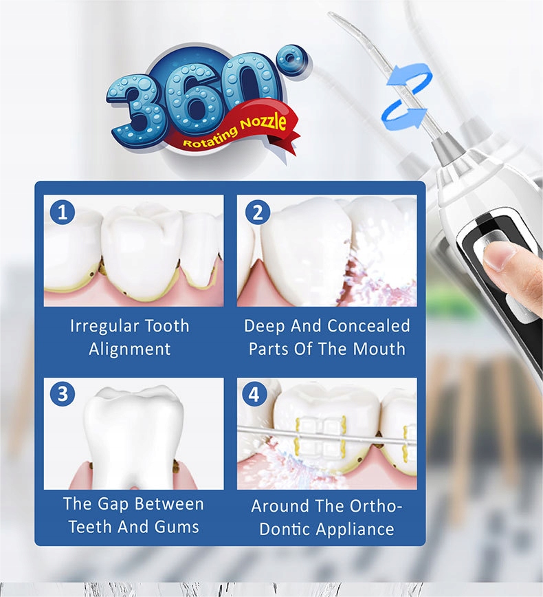 - Badania naukowe dowiodły że po 28 dniach używania irygatora nastąpiło w 40%-93% obniżenie krwawienia i zapalenia dziąseł.
