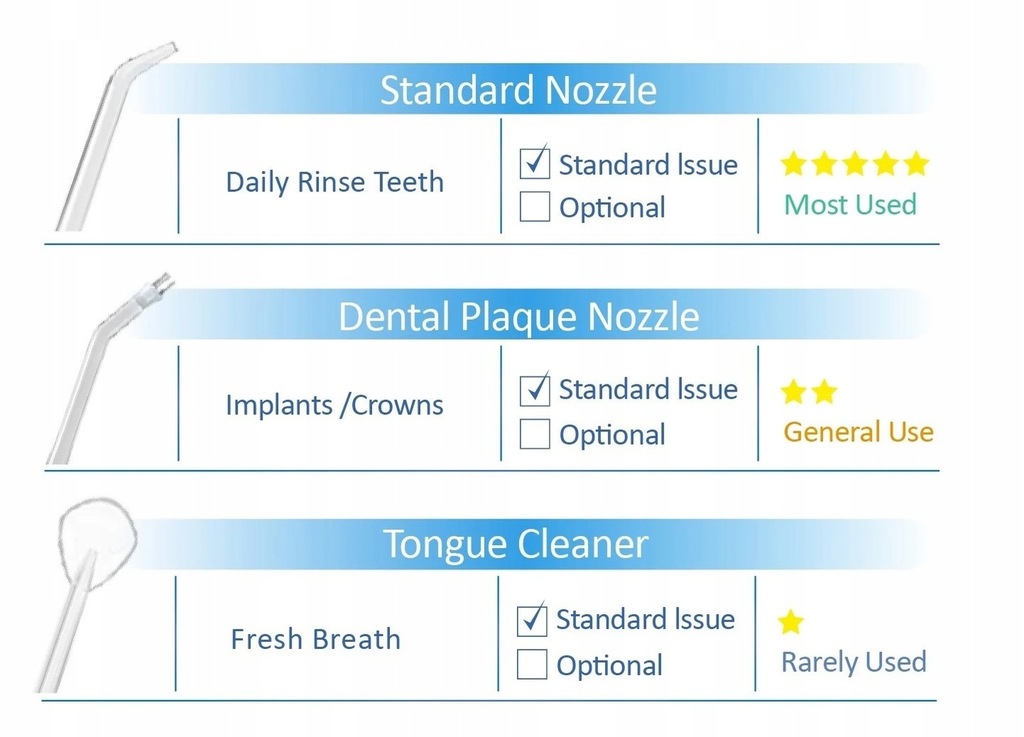 - 3 standardowe końcówki, które głęboko oczyszczają przestrzeń międzyzębową i masują dziąsła;