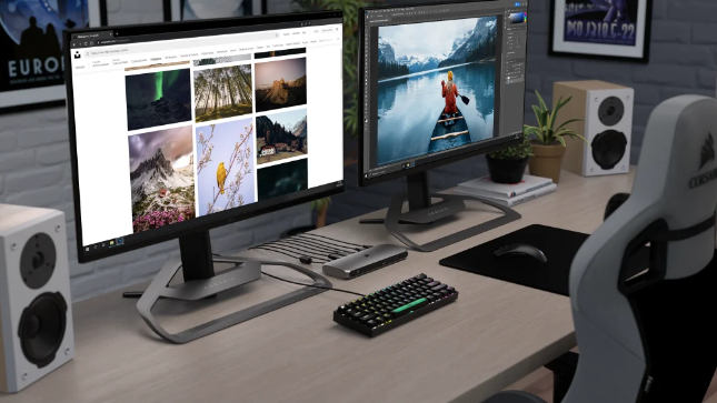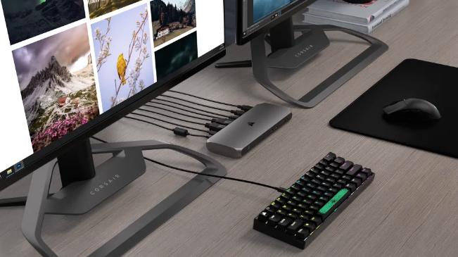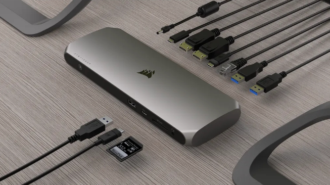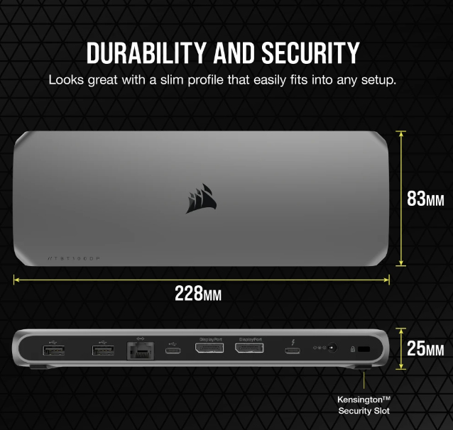 Stacja dokująca Corsair TBT100 Thunderbolt 3 daje możliwość jednoczesnego podłączenia kilku urządzeń do komputera Mac lub PC. Zapewnia przy tym przepustowość do 40 Gb/s i dzięki technologii Smart Charging zapewnia efektywne ładowanie laptopa. Kilka portów – takich jak USB-C 3.1 SuperSpeed 10 Gb/s, USB-A 3.1 SuperSpeed 5 Gb/s i HDMI – umożliwia połączenie z nowoczesnymi urządzeniami i konfigurację z dwoma monitorami. Jedno złącze Gigabit Ethernet, 3,5 mm-Kombi-złącze ze wzmocnionym dźwiękiem audio i czytnikiem kart UHS-II SD uzupełniają wszechstronne połączenia TBT100. Jednocześnie zamek Kensington zintegrowany z wytrzymałą aluminiową obudową zapewnia ochronę przed kradzieżą.