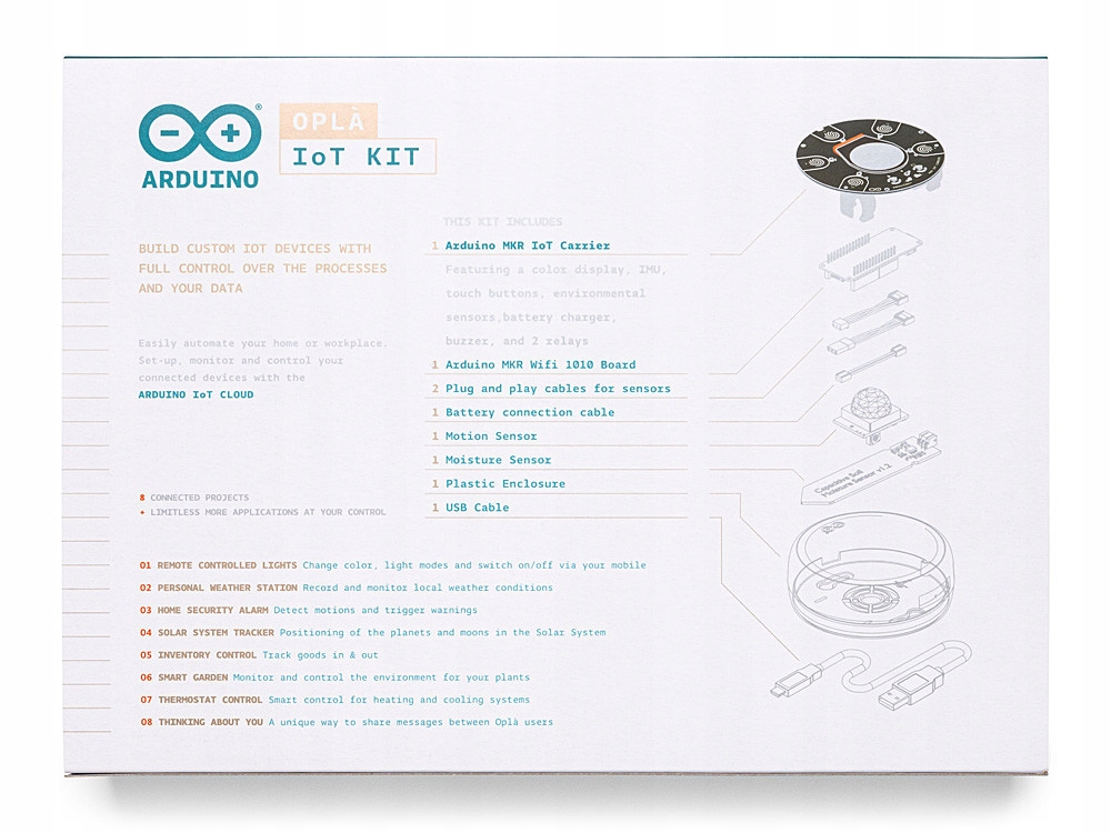 OPLÀ to pierwsza platforma programistyczna IoT, która umożliwia tworzenie własnych urządzeń IoT z pełną kontrolą nad ich algorytmami i własnymi danymi. Podłączonymi urządzeniami można zarządzać w chmurze Arduino® IoT Cloud. Znajdują się tam również informacje odczytane z czujników. Zestaw umożliwia stworzenie 8 projektów: 4 gotowe do rozmieszczenia w domu oraz 4 w celu poznania IoT, koncepcje i sposoby jego zastosowanie w życiu codziennym. Zawiera on m.in takie elementy jak: Arduino® MKR 1010, wyświetlacz OLED, płytkę MKR IoT Carrier Board, czujniki i przewody.