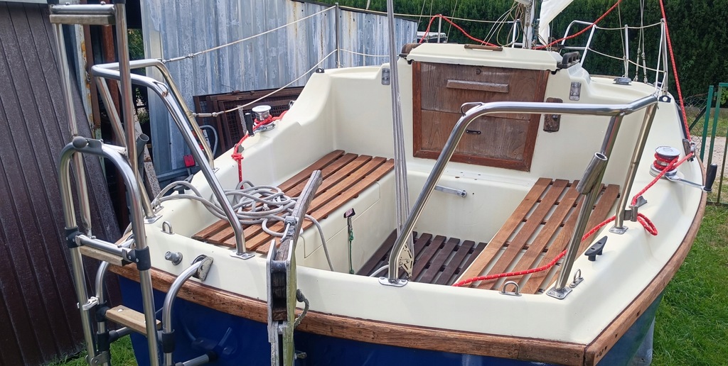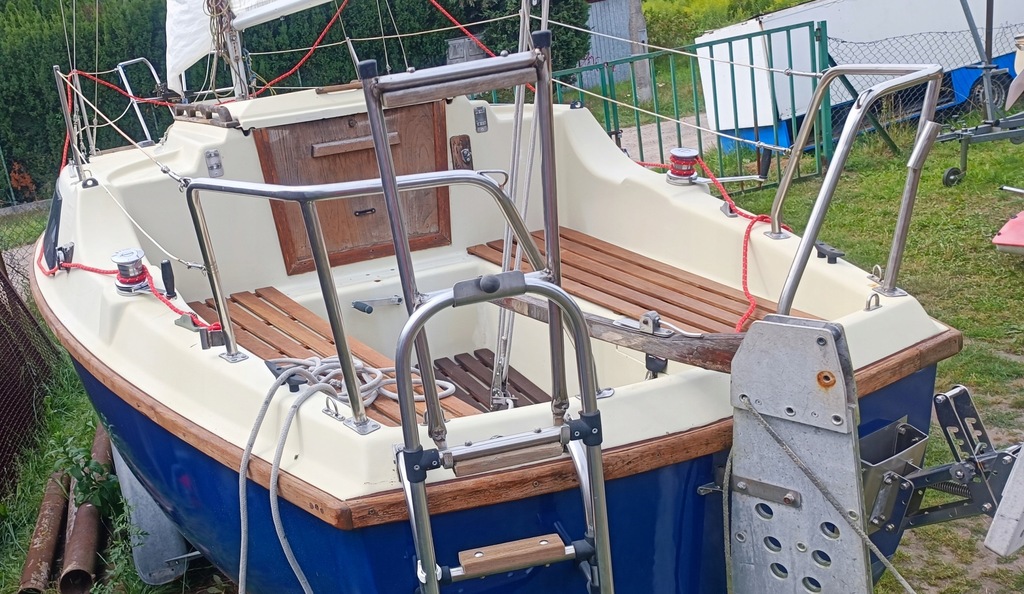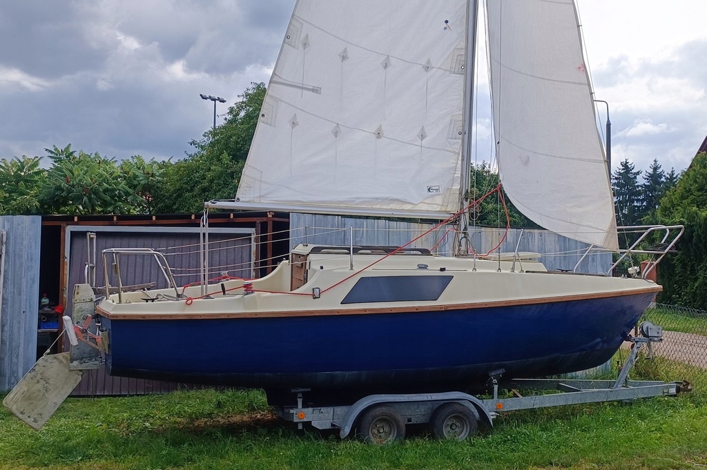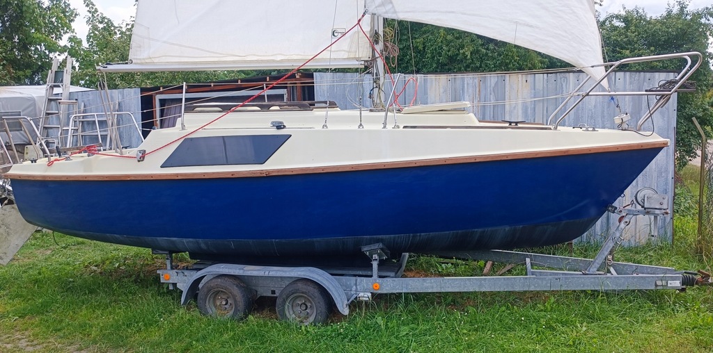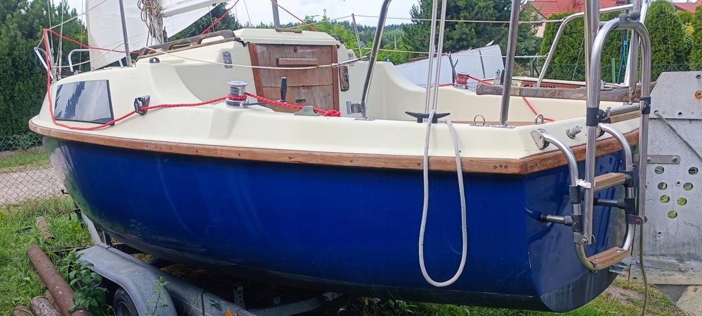 Żaglówka sprowadzona z Niemiec w oryginalnym białym żelkocie, burty malowane.