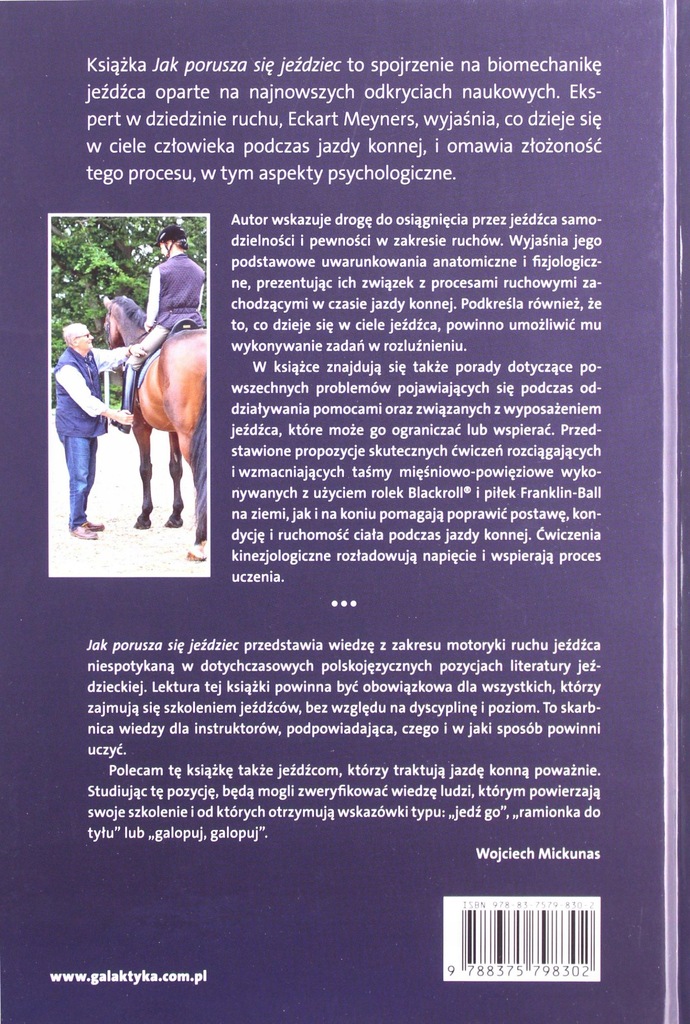 Jak porusza się jeździec to bardzo ciekawe spojrzenie na biomechanikę jeźdźca oparte na najnowszych odkryciach naukowych. Ekspert w dziedzinie ruchu, Eckart Meyners, wyjaśnia, co dzieje się w ciele człowieka podczas jazdy konnej, i omawia złożoność tego procesu, w tym aspekty psychologiczne.