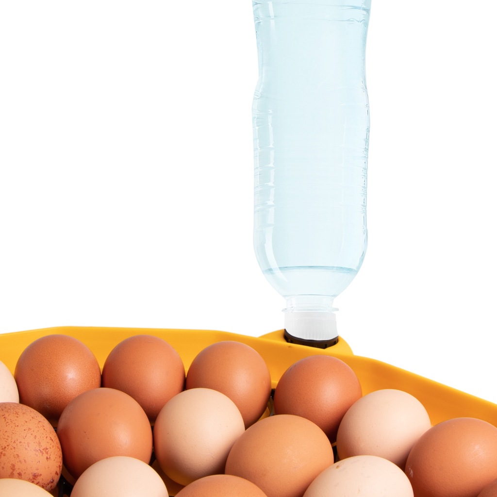 W zestawie jest sprytny "korek" do zwykłej butelki (np: Coca-Cola). Korek ten dozuje wodę po przyciśnięciu butelki , ułatwi Ci to dolewanie i kontrolę ilości wody, a tym samym wilgotności wewnątrz inkubatora.