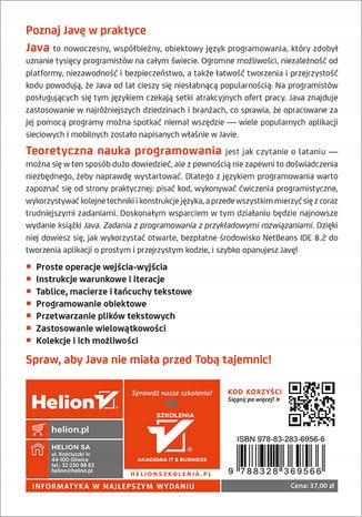 Java to nowoczesny, współbieżny, obiektowy język programowania, który zdobył uznanie tysięcy programistów na całym świecie. Ogromne możliwości, niezależność od platformy, niezawodność i bezpieczeństwo, a także łatwość tworzenia i przejrzystość kodu powodują, że Java od lat cieszy się niesłabnącą popularnością, na programistów posługujących się tym językiem zaś czekają setki atrakcyjnych ofert pracy. Java znajduje zastosowanie w najróżniejszych dziedzinach i branżach, co sprawia, że opracowane za jej pomocą programy można spotkać niemal wszędzie - wiele popularnych aplikacji sieciowych i mobilnych zostało napisanych właśnie w Javie.