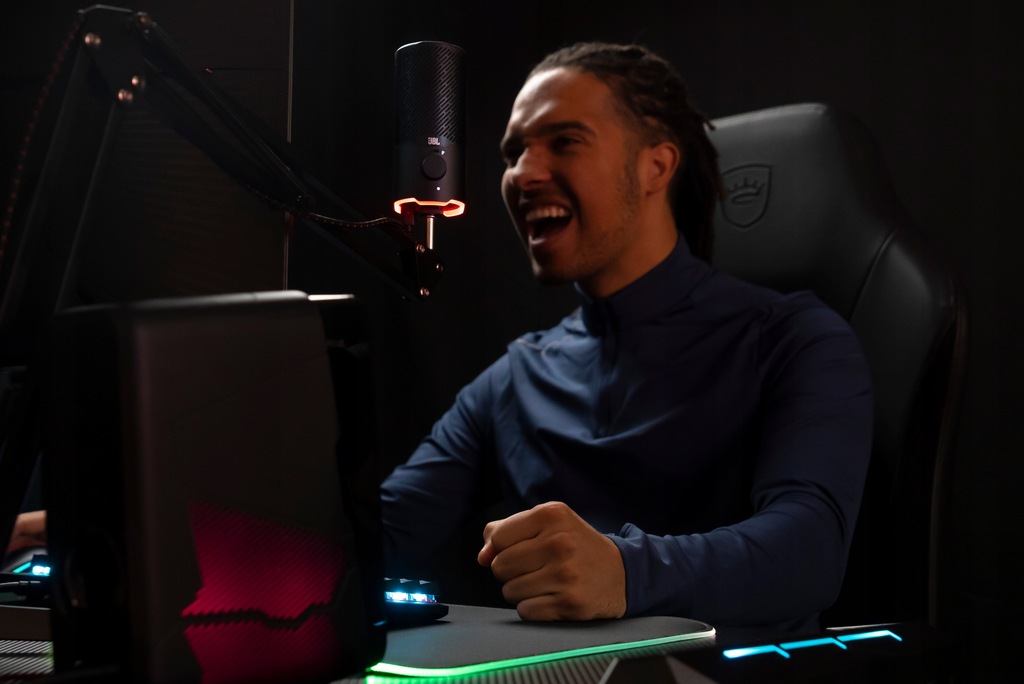 Stylowy i wytrzymały mikrofon JBL Quantum Stream posiada aluminiową podstawkę oraz metalowy pierścień