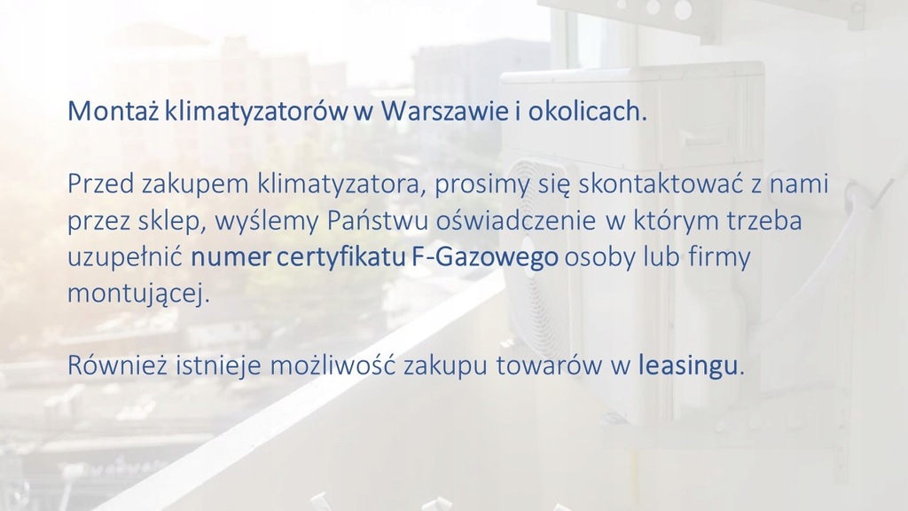 Przed zakupem klimatyzatora, prosimy się skontaktować z nami przez sklep, wyślemy Państwu oświadczenie w którym trzeba uzupełnić numer certyfikatu F-Gazowego osoby lub firmy montującej.