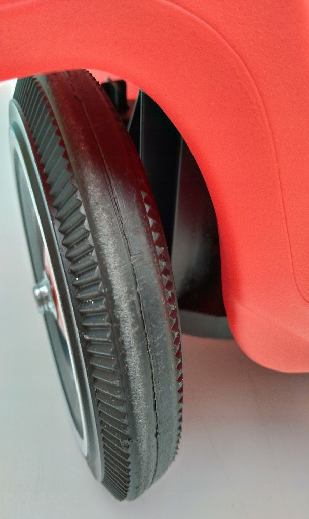- W standardzie jeździk posiada sterowane, cichobieżne koła, dobrze wyprofilowaną bezpieczną kierownicę z klaksonem, nisko położony środek ciężkości, uchwyty holowniczy z przodu i hak do przyczepy z tyłu.