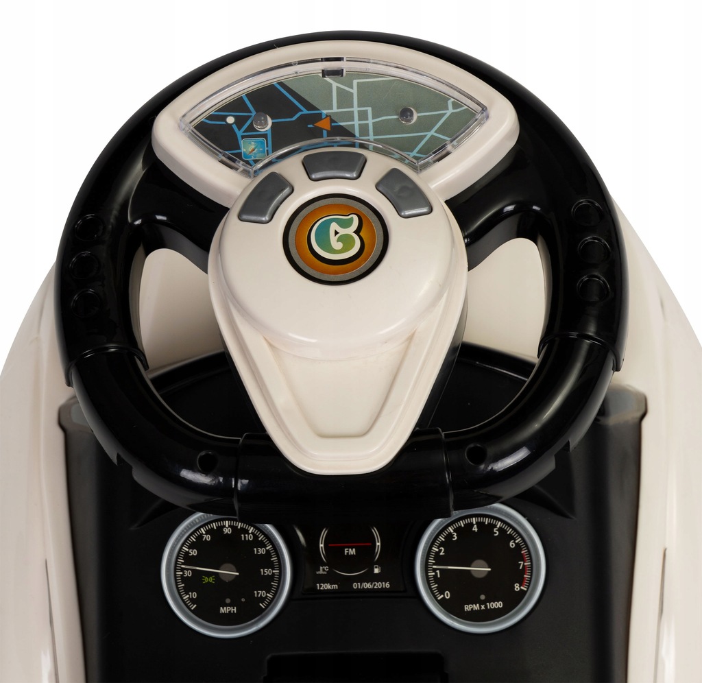 Na kierownicy znajdują się 3 przyciski, które odpowiadają za odtwarzanie dźwięków. Jeździk posiada zaprogramowane 3 melodie oraz dźwięk klaksonu. Dzięki tej funkcji zabawa stanie się jeszcze bardziej wciągająca.