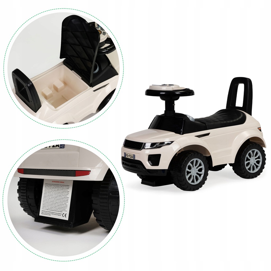 - Pod otwieraną klapą siedziska ukryty jest funkcjonalny schowek na wszystko to, co jest potrzebne małemu kierowcy do zabawy.