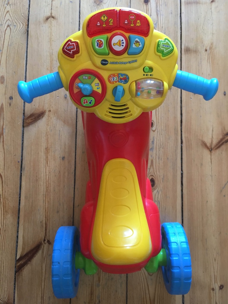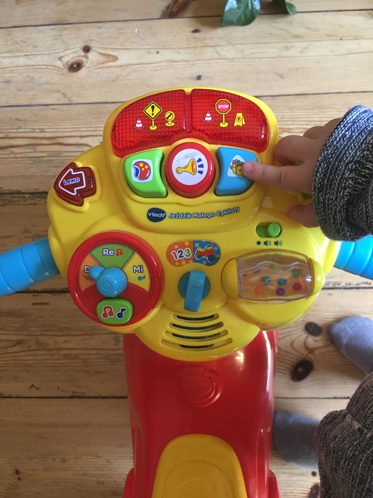 Posiada podświetlane przyciski - kierunkowskazy, a dopiero po zapaleniu się zielonego światła można ruszyć w drogę!