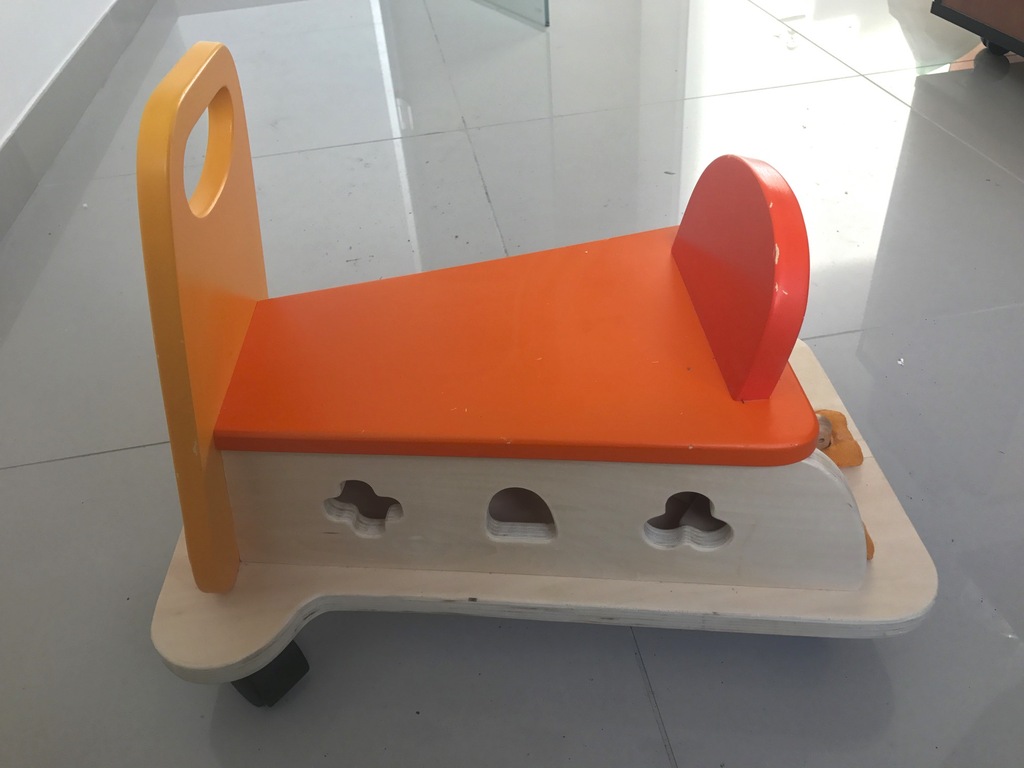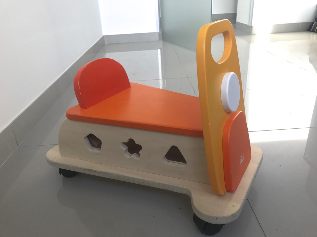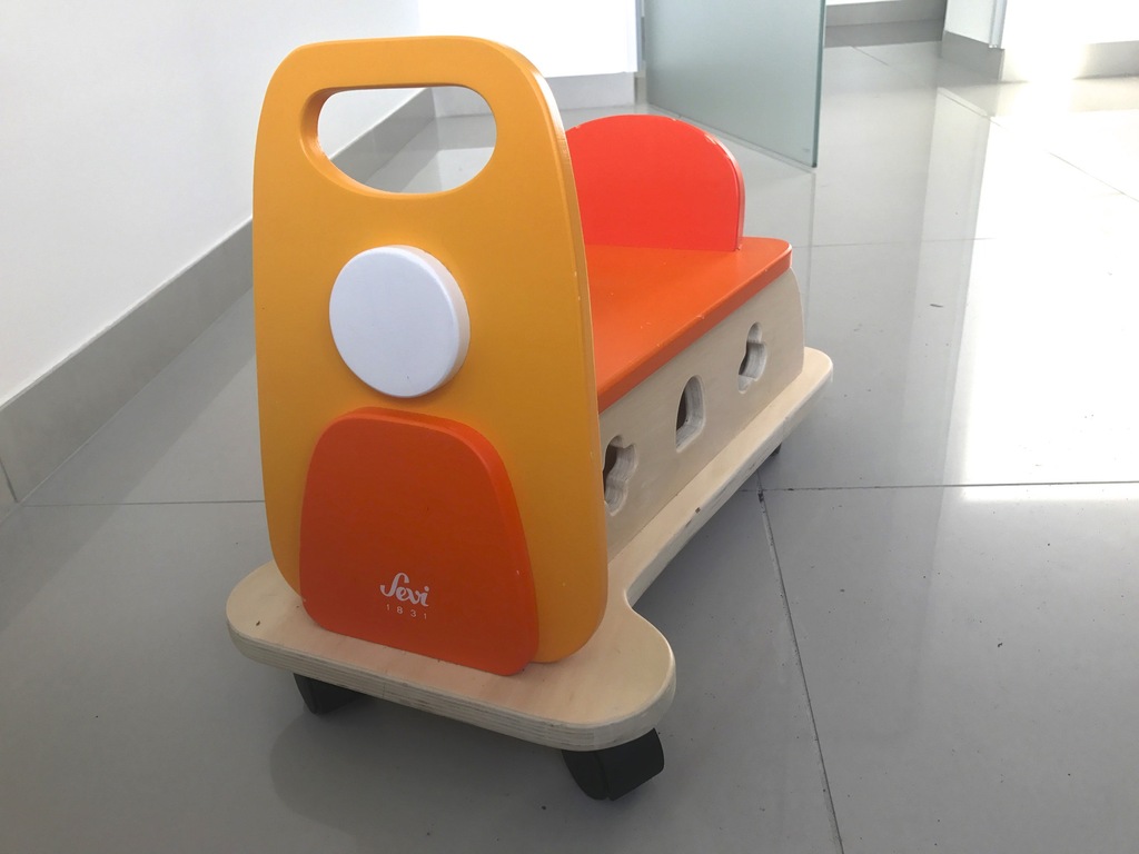 Wykonany z drewna, malowany nietoksycznymi farbami wodnymi. Jest solidnie wykonany. Jego kółeczka są mocne ale pozwalają maluchowi na bardzo swobodną jazdę i odpychanie się nóżkami. Na bokach jeździka znajduje się 6 otworów na drewniane klocki o różnych kształtach. Tworzy to bardzo sprytne połączenie jeździka z sorterem. Wszystkie krawędzie i brzegi są obłe i doskonale wyszlifowane a więc bardzo bezpieczne dla dziecka. Design moim zdaniem wspaniały - typowo włoski, z resztą można ocenić po zdjęciach.
