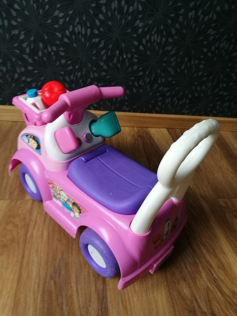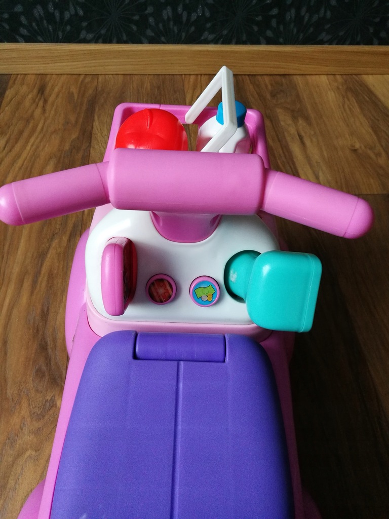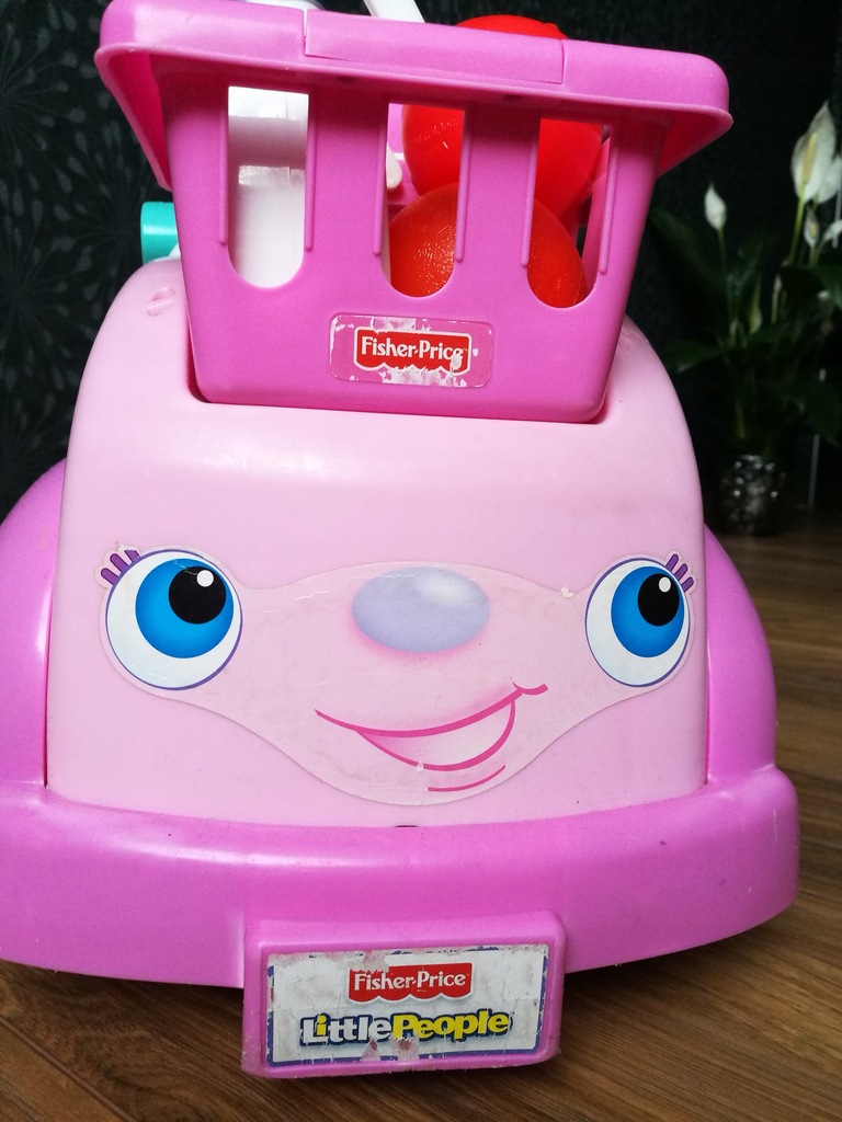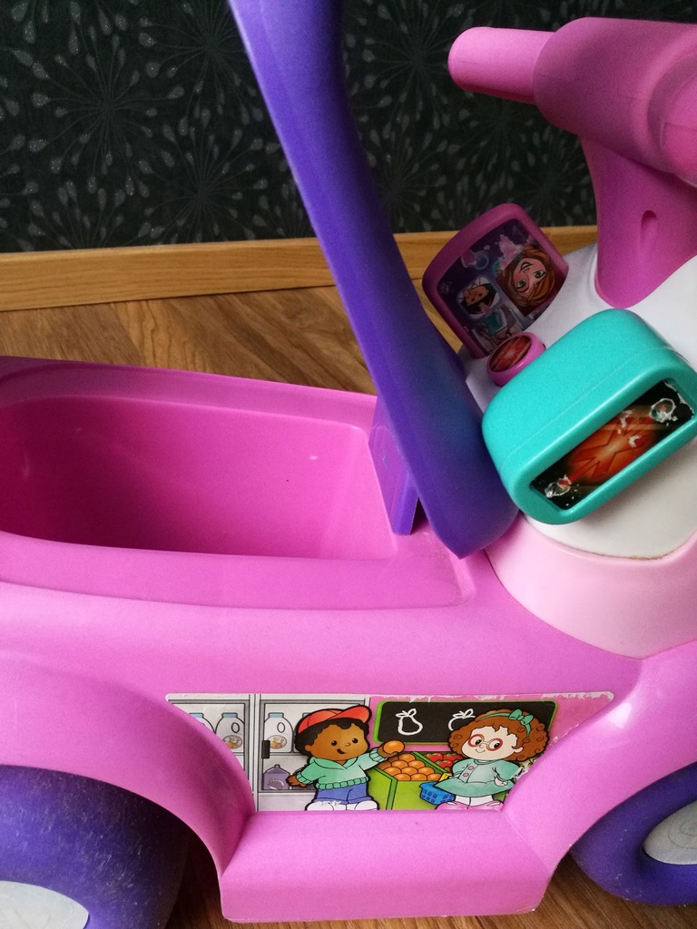Sprzedaje jeździć marki Fisher Price sklep W skład którego wchodzi samochodzik ze skrytką w siedzisku, skaner, telefon, koszyk, pomidor, pomarańcza i mleko. Samochodzik wydaje 4 dźwięki dwa to przyciski i dwa gdy wkłada się telefon i skaner. Głośność można zmieniać pod podwoziem.