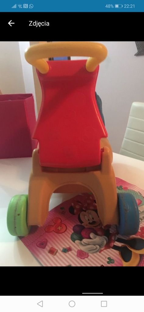 Jeździk pchacz Fisher Price. Piesek działa bez zarzutów stan oceniam na b.dobry jedyne wady to na kółkach bo córka dużo nim jeździła :) ale po domu. Niestety już wyrosła z tego :) klocków nie posiadam bo zakupiłam już go bez klocków. zapraszam.