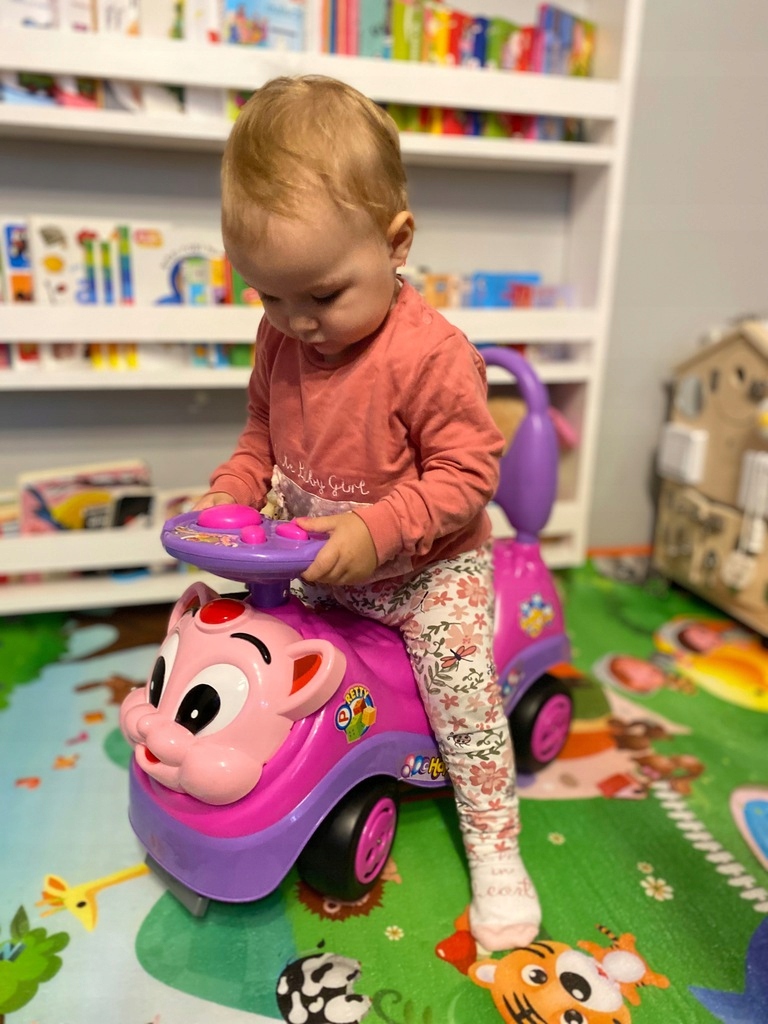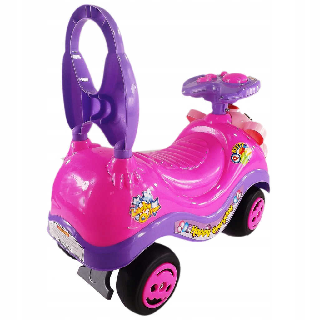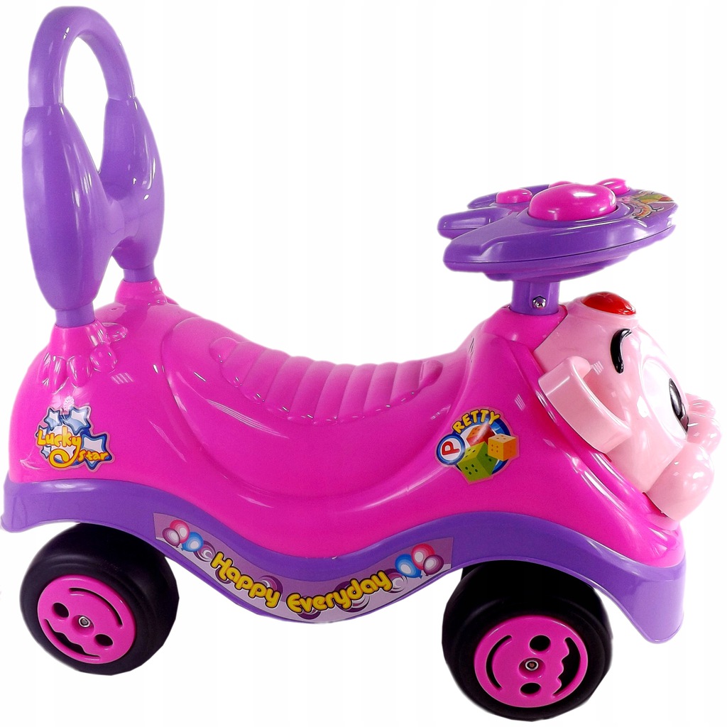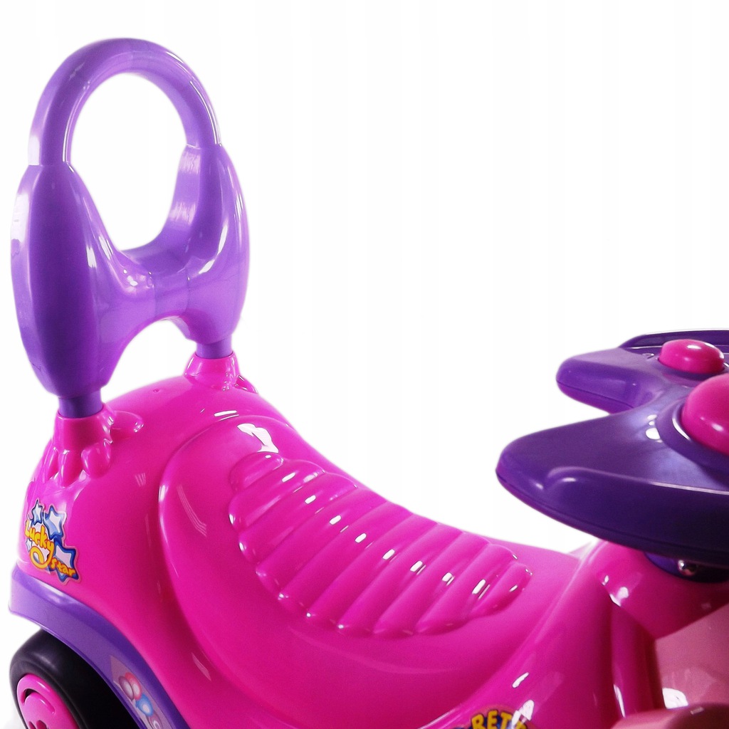 - Jeździk posiada dużą kierownicę. W kierownicy ma przyciski z dźwiękami, które uatrakcyjnią zabawę.