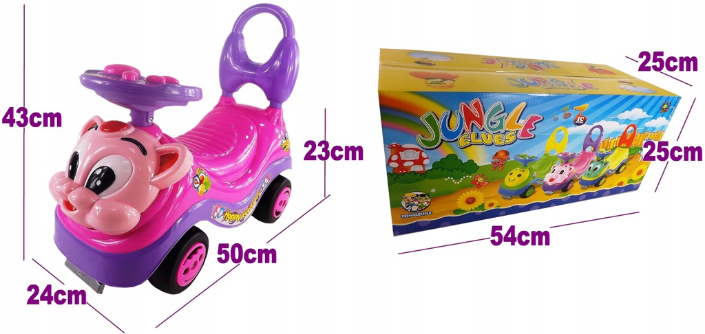 - Jeździk posiada skrętne koła. Koła łączone są na pręt metalowy.