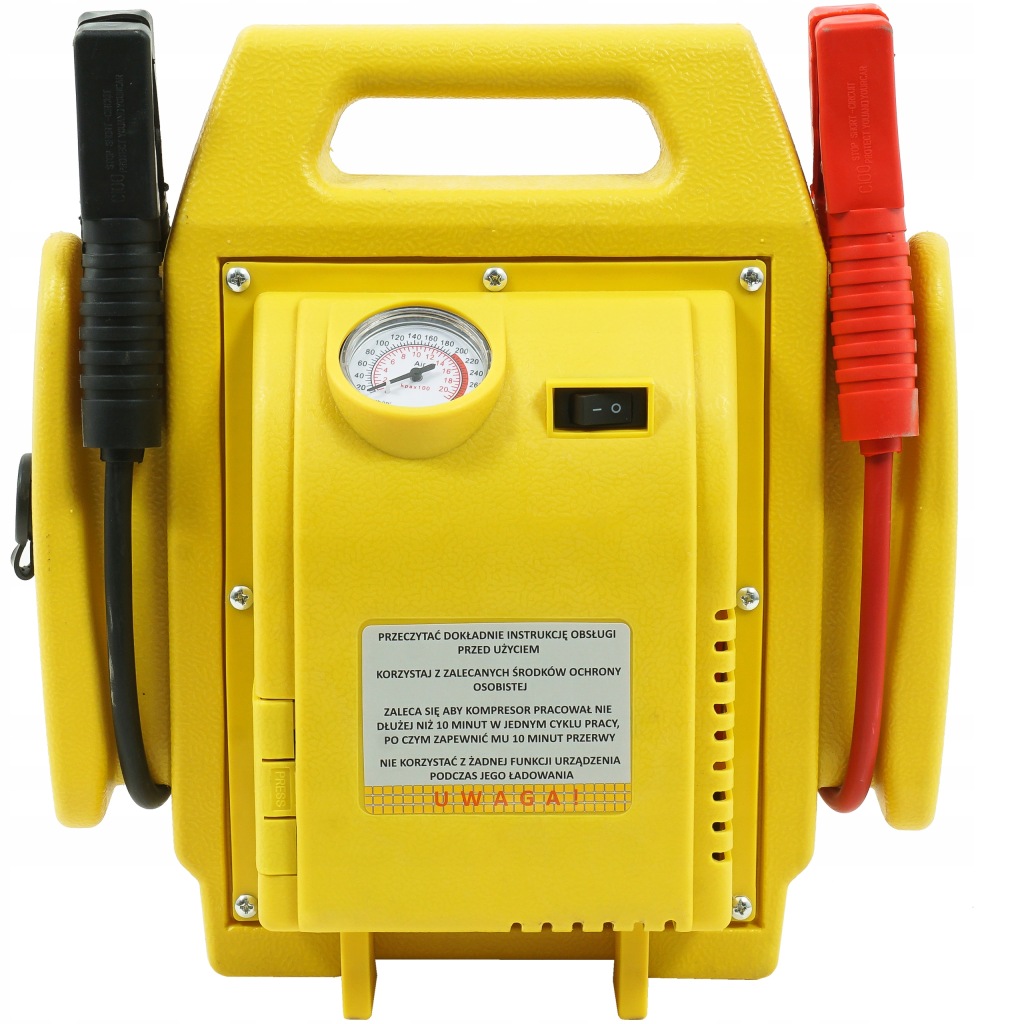 - SPECYFIKACJA - napięcie zasilania: 12V; napięcie ładowania: 12V; długość kabli z klemami: 50 cm; ciśnienie kompresora: 20 bar / 300 PSI; manometr: tak; pojemność akumulatora: 17 Ah; napięcie akumulatora: 12V; moc szczytowa: 900 A; moc początkowa 500A; typ akumulatora: ołowiowo-kwasowy; latarka: tak; czas ładowania: od 8 do 48 godzin; wymiary: (wys./szer./ gł.) 37x36x17cm; waga: 6,8 kg; waga w opakowaniu 7,35 kg.