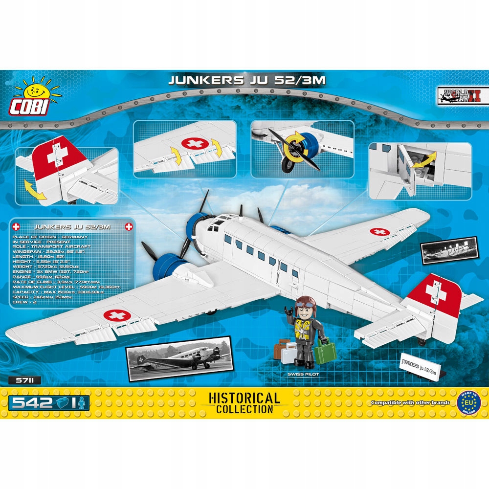Junkers Ju-52/3m g4e Niemiecki średni samolot pasażerski i transportowy skonstruowany w wytwórni Junkers w latach 30. XX wieku. Stanowił podstawowy samolot transportowy armii niemieckiej w okresie II wojny światowej. Bardzo rozpowszechniony, używany w służbie cywilnej i wojskowej w wielu krajach. Tutaj występuje w malowaniu cywilnych szwajcarskich linii lotniczych JU-AIR, które wciąż eksploatują te maszyny.