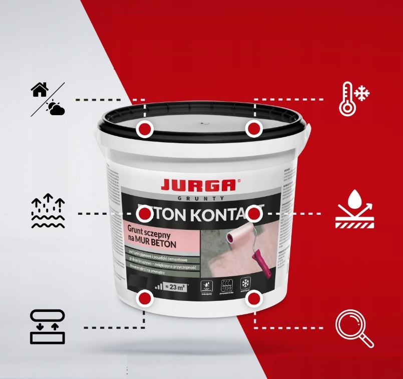 Jurga Beton Kontakt to wysokiej jakości grunt sczepny stworzony na bazie innowacyjnej dyspersji oraz obfitości i grubości kruszywa kwarcowego. Charakteryzuje się niezwykle silną przyczepnością do powierzchni mineralnych, szczególnie do gładkich i niechłonnych, takich jak beton, żelbet, stropy, cegły, tynki, bloczki, płyty gipsowo-kartonowe (G-K), płytki itp. Ten produkt doskonale wyrównuje chłonność podłoża, przyczyniając się do optymalnego wzmocnienia wytrzymałości. Po wyschnięciu uzyskuje odporność na wodę i mróz. Charakterystycznym elementem jest jego różowa barwa, ułatwiająca równomierne rozprowadzanie.