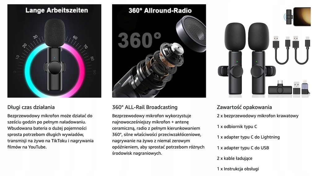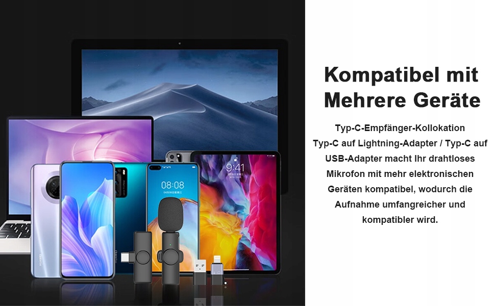 - Rozszerzona kompatybilność: bezprzewodowy mikrofon krawatowy do smartfona/ urządzenia z Androidem posiada odbiornik ze złączem USB-C ale został również wyposażony w przejściówkę USB-C na Lightning i przejściówkę USB-C na USB-A; dzięki adapterowi możesz uzyskać pełną łączność z telefonami/ urządzeniami z systemem Android/ komputerami PC, uzyskując bezproblemowe połączenie