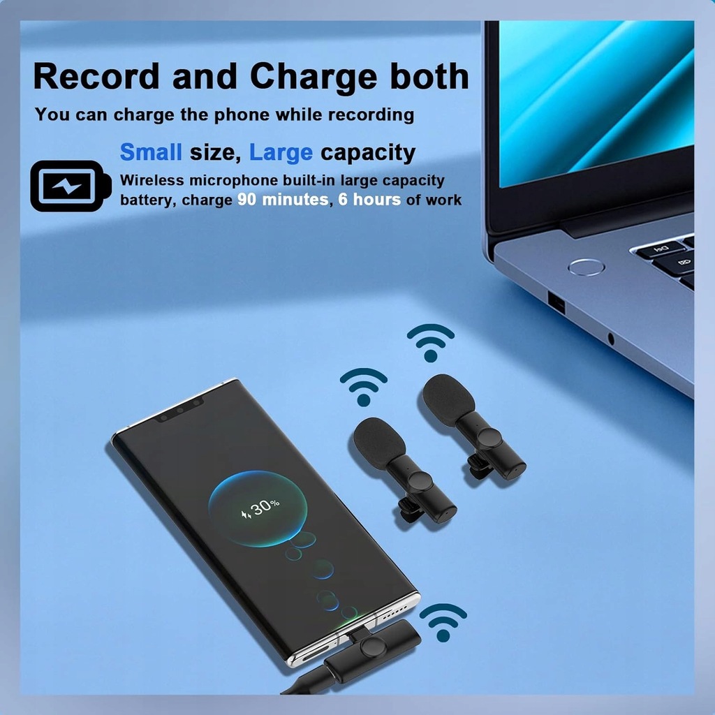 - Plug and Play: podwójny bezprzewodowy mikrofon krawatowy nie wymaga połączenia Bluetooth/ WiFi ani specjalnego oprogramowania; wystarczy podłączyć odbiornik do smartfona/ tabletu/ komputera i długim naciśnięciem włączyć mikrofon- połączenie zostanie nawiązane automatycznie