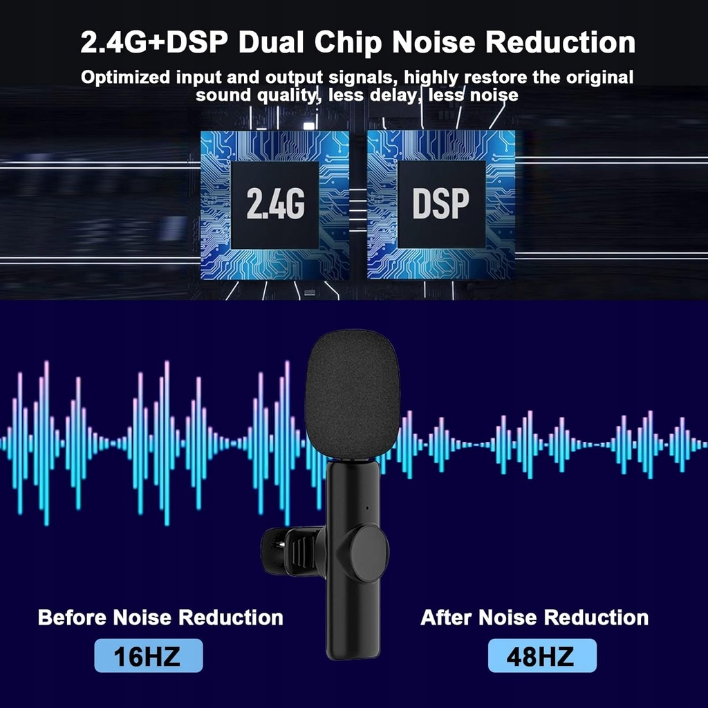 - Inteligentna redukcja szumów DSP: bezprzewodowy mikrofon przenośny ma wbudowaną technologię aktywnej redukcji szumów DSP; układ DSP może bezpośrednio wpływać na proces optymalizacji sygnału wejściowego i wyjściowego, łatwo izolując hałas otoczenia i zapewniając wszechstronną jakość odbioru radiowego 360°; w mikrofonie Clip Mic została zastosowana gąbczasta osłona, co skutecznie redukuje szum wiatru i zakłócenia dźwięku, przekazując w pełni oryginalny dźwięk