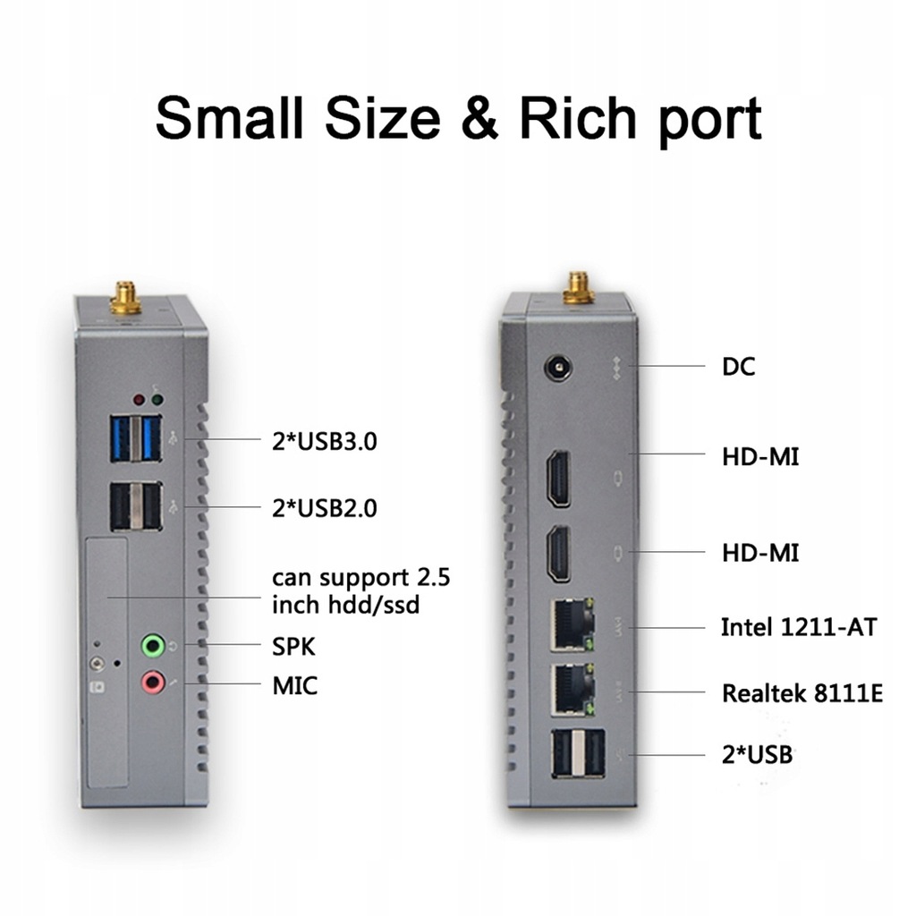 6. Multi-ports: 2xLAN ports, 2xHDMI ports, 4xUSB2.0, 2xUSB3.0, 1xDC port, 1xHDD slot, SPK, MIC