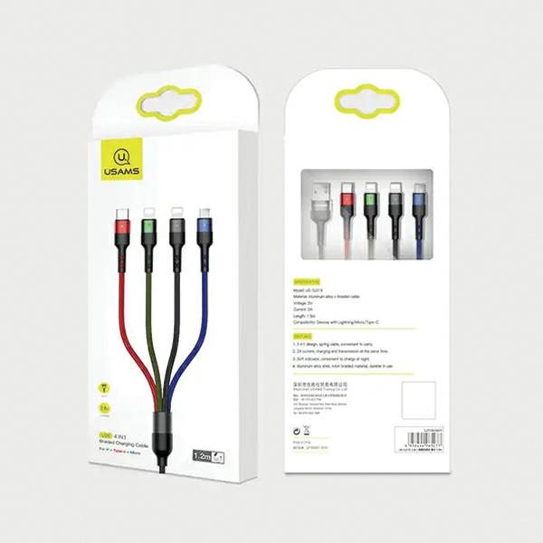 Kabel USAMS US-SJ317 U26 to produkt wysokiej jakości, o mocnej konstrukcji i niemal uniwersalnym zastosowaniu. Akcesorium zostało wyposażone w cztery końcówki (2x złącze lightning, 1x microUSB i 1x USB-C), dzięki czemu umożliwia jednoczesne ładowanie 4 urządzeń.