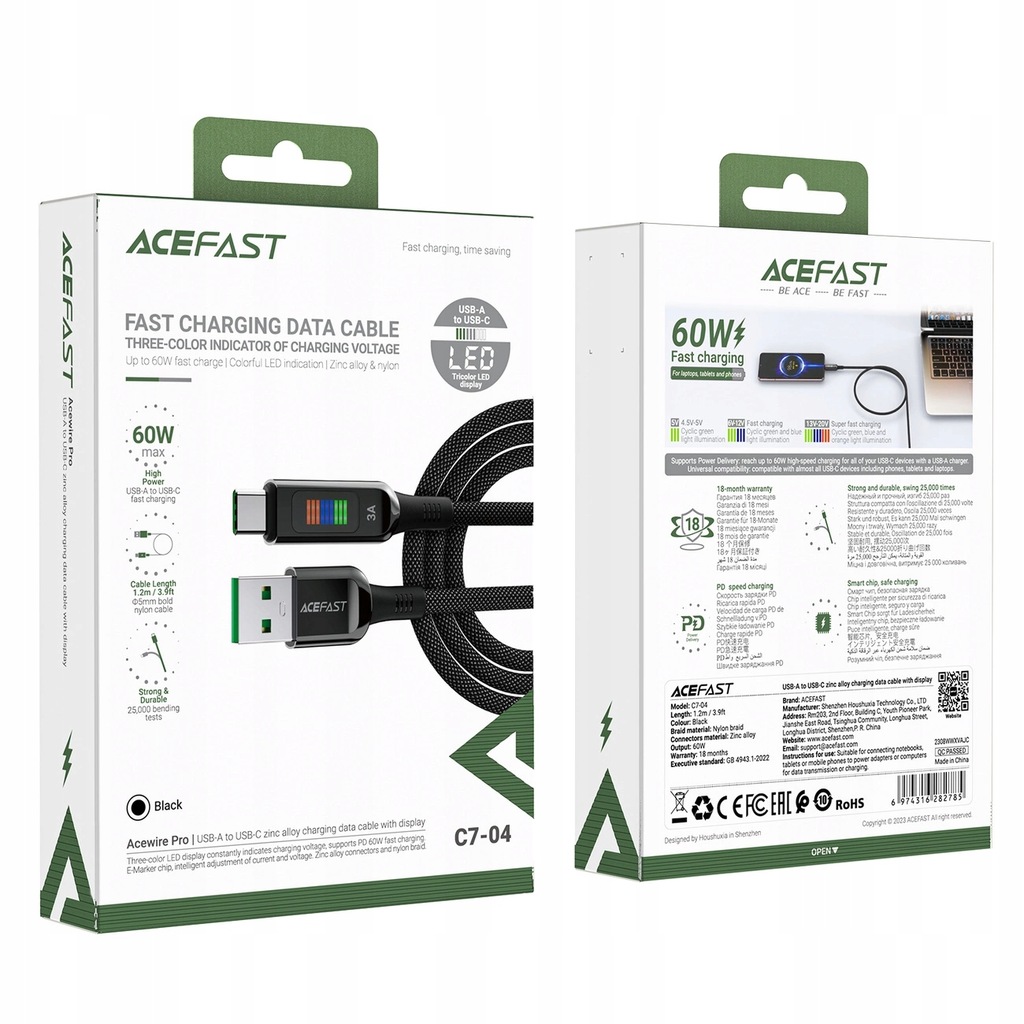 Kabel Acefast C7-04 zapewnia błyskawiczne ładowanie z mocą do 60 W. Umożliwia monitorowanie napięcia ładowania dzięki wbudowanemu ekranowi LED. Dodatkowo posiada chip, który automatycznie reguluje napięcie i natężenie podczas ładowania. Współpracuje ze smartfonami, tabletami i laptopami.