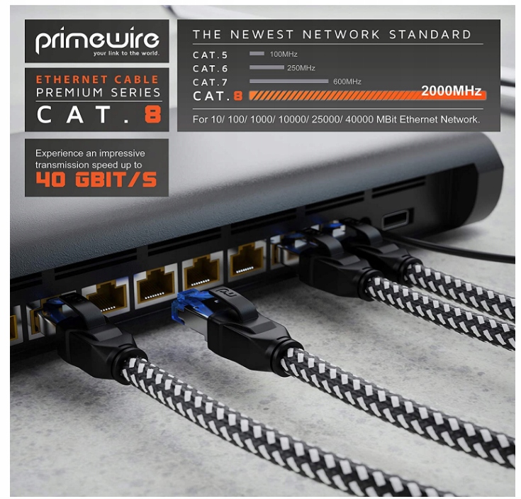 Nasz 3-metrowy kabel sieciowy Primewire CAT 8 (standard 8.1, klasa 1) zapewnia imponującą szybkość transmisji do 40 Gb/s. Idealny do sieci Ethernet 10/100/1000/10000/25000/40000 MBit. | 304365