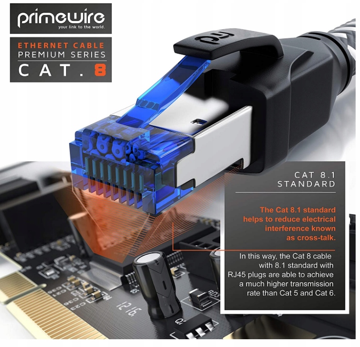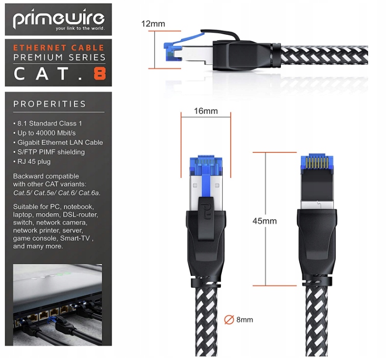 Osiąga znacznie wyższą szybkość transmisji niż kable Cat 5, Cat 6 lub Cat 7 dzięki standardowi Cat 8.1.