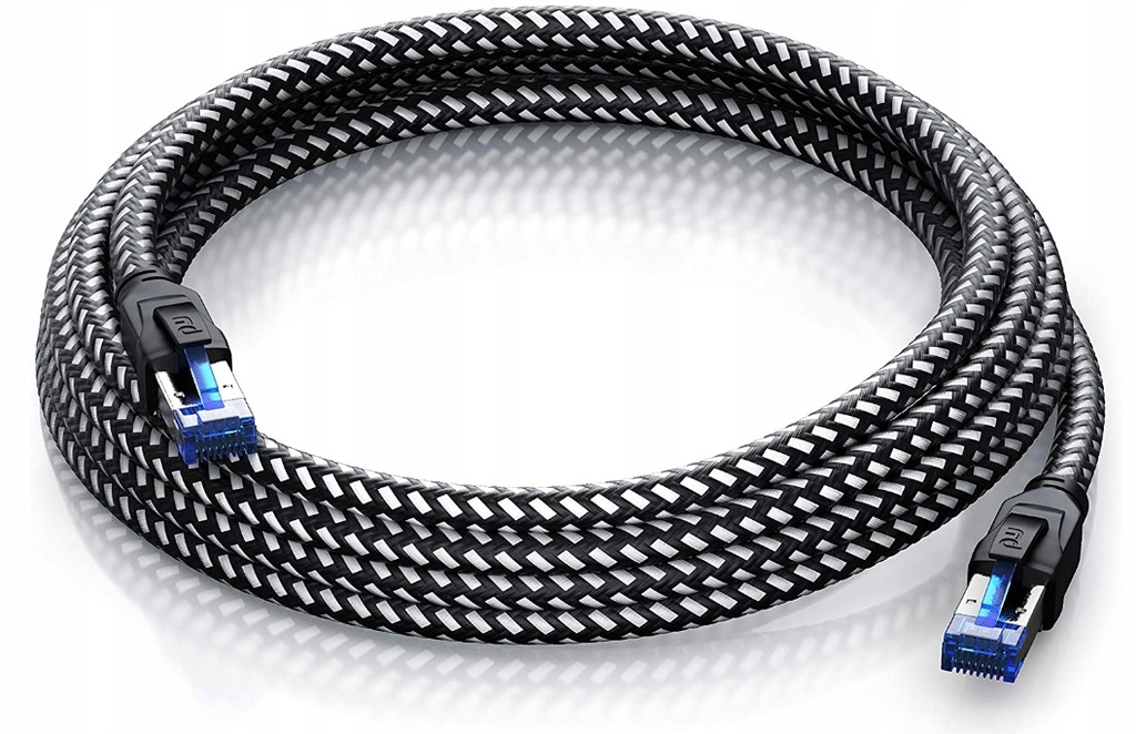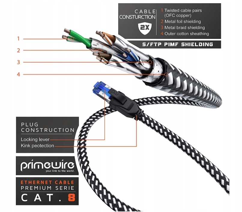 Budowa: Podwójnie ekranowany kabel ethernetowy typu skrętka z wysokiej jakości miedzianymi żyłami wewnętrznymi. Wiele par w folii metalowej (PiMF) i dodatkowe ogólne ekranowanie. Izolacja bezhalogenowa. Poszycie z tkaniny. Kompatybilny ze wszystkimi urządzeniami korzystającymi z sieci RJ45