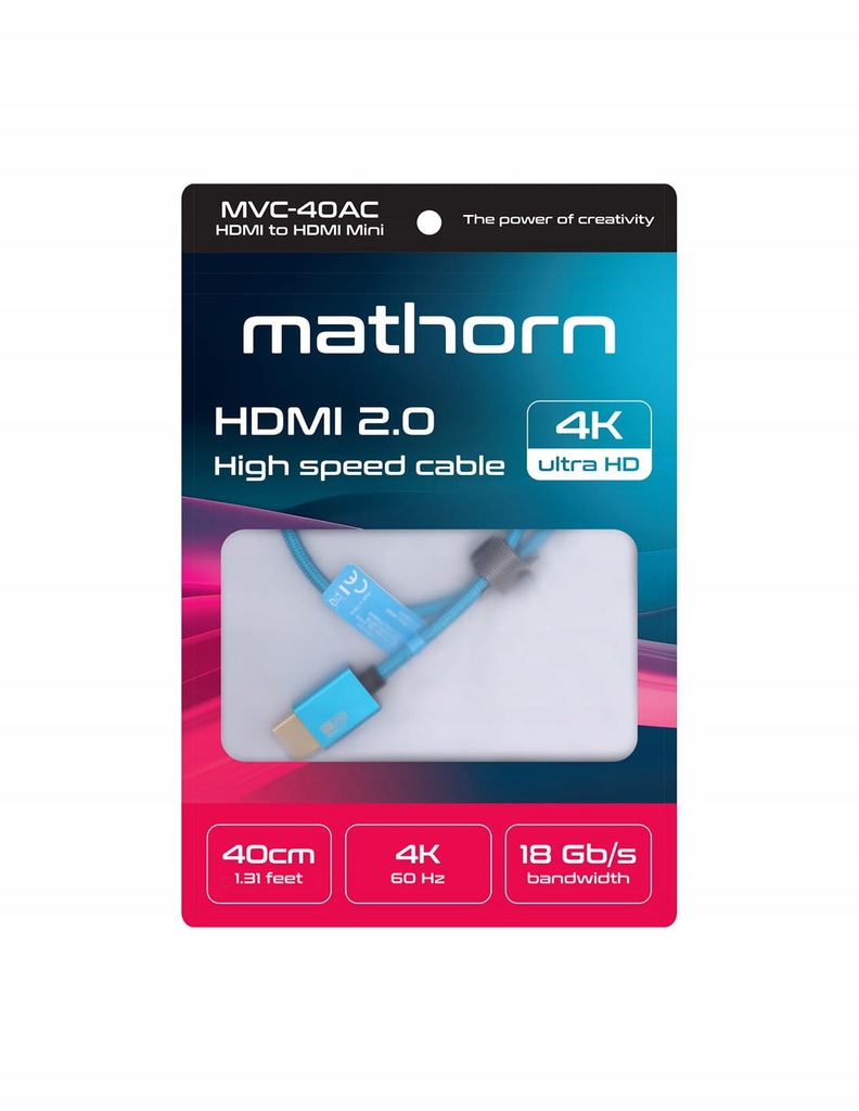 Mathorn MVC-40AC to wysokiej klasy kabel HDMI o długości 40 centymetrów przeznaczony do nagrywania i transmisji strumieniowej w standardzie UltraHD. Z jednej strony zakończony jest standardowym złączem HDMI typu A, a z drugiej HDMI Mini typu C. Kabel zapewnia kompatybilność ze standardem HDMI 2.0 i obsługuje przepustowość danych do 18 Gbit/s oraz przesył obrazu HDR w rozdzielczości do 4K/60Hz. W pełni ekranowane przewody kabla chronione są otuliną wykonaną z PVC oraz dodatkowo wzmocnione nylonową plecionką w charakterystycznym dla marki Mathorn kolorze ArcticBlue. Wysoką odporność mechaniczną kabla zapewniają również dwukomponentowe obudowy złącz HDMI, które wykonane zostały z tworzywa PVC wzmocnionego aluminiowym ekranowaniem w kolorze poszycia kabla.