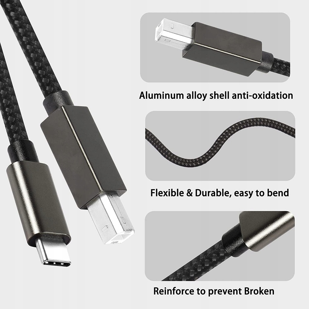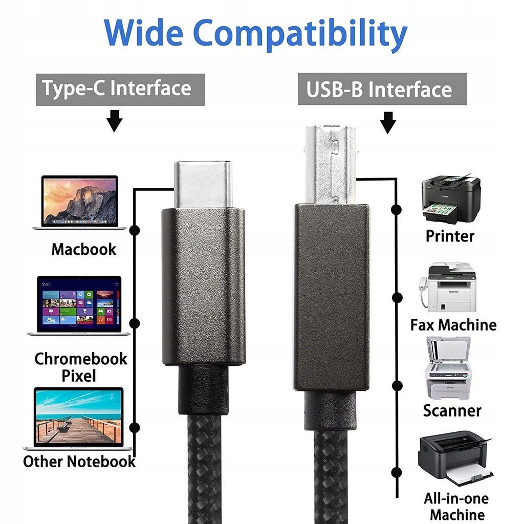 Kabel ten łączy urządzenia obsługujące USB-C (MacBook Pro, Surface Book 2, Chromebook Pixel itp.) do urządzeń USB B 2.0 i urządzeń peryferyjnych (starsze drukarki, skaner, pianino cyfrowe Yamaha Casio, kontroler MIDI, klawiatura elektryczna itp.)