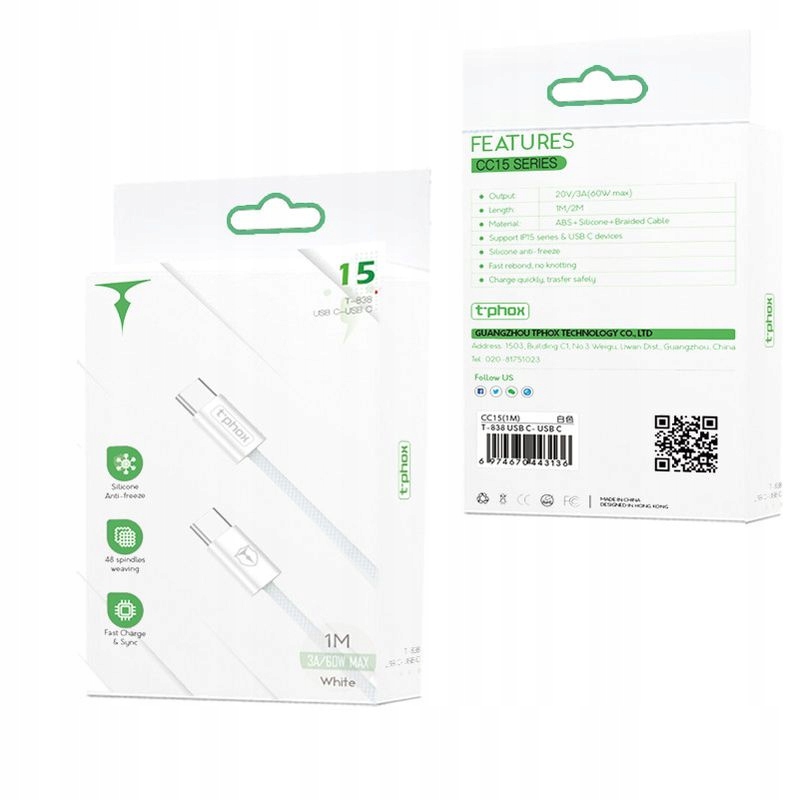 KABEL T-PHOX CC15 SERIES USB-C/USB-C 60W 3A 1M WHITE