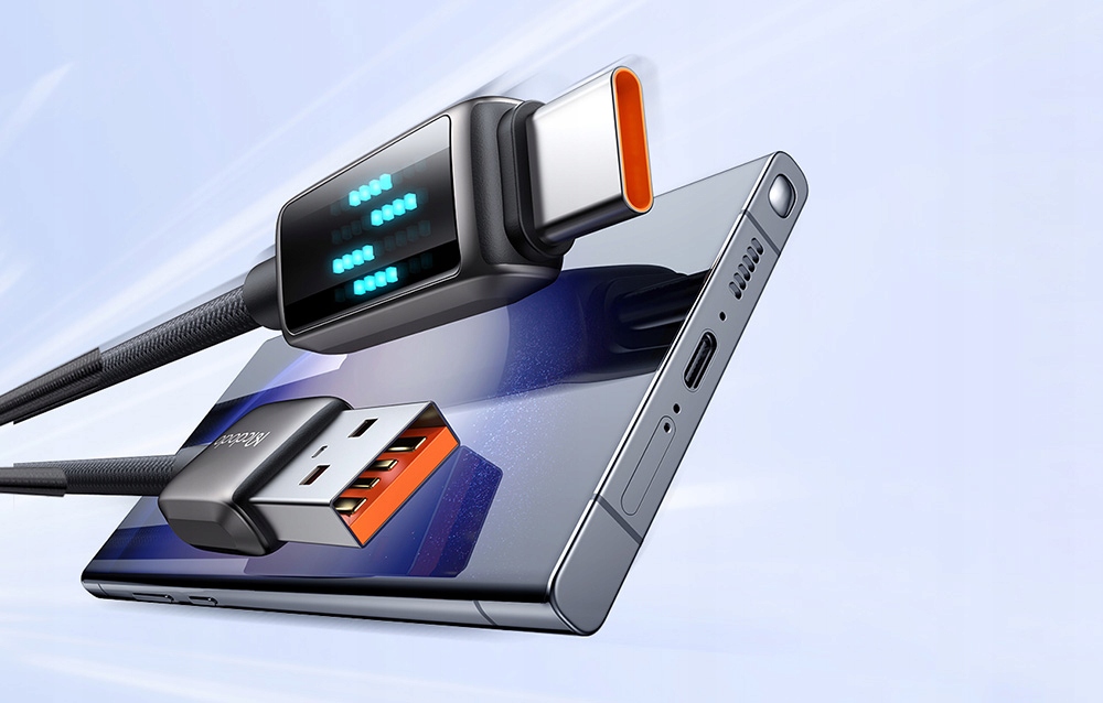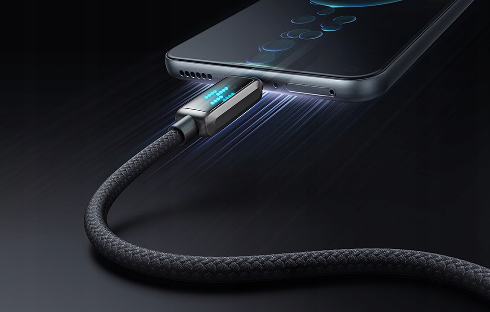 Wbudowany wyświetlacz LED pokazuje prędkość ładowania w czasie rzeczywistym, dzięki czemu zawsze wiesz, jak szybko ładuje się Twoje urządzenie. Efekty świetlne dodatkowo nadają kablowi nowoczesny, dynamiczny wygląd, co czyni go nie tylko praktycznym, ale i stylowym dodatkiem.