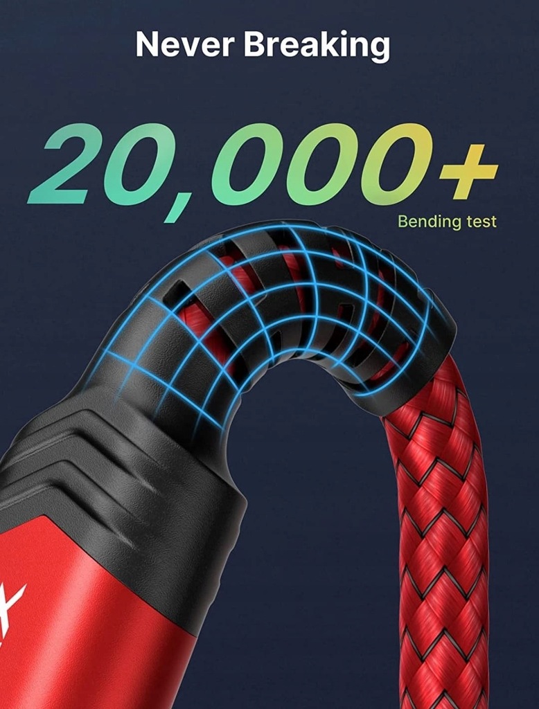 - 【Materiał klasy wojskowej】 Mocne włókno wojskowe, najbardziej elastyczny, mocny i trwały materiał, zwiększa siłę rozciągania o 200%. Specjalna konstrukcja odciążenia, może wytrzymać test na zginanie ponad 10 000. Aluminiowa obudowa premium sprawia, że kabel jest bardziej trwały