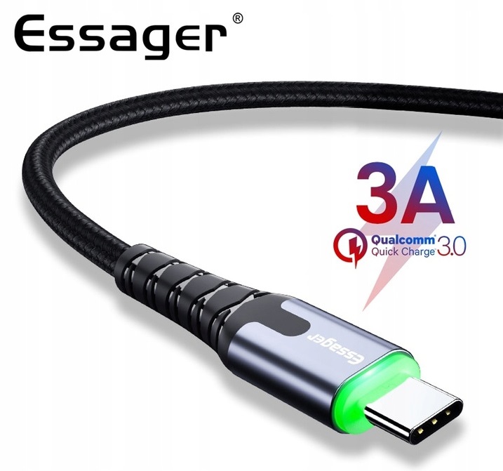 - KABEL USB-C 3.0A MARKI ESSAGER® 100CM, WBUDOWANA DIODA LED- QUALCOMM QuickCharge 3.0 Z NYLONOWYM OPLOTEM