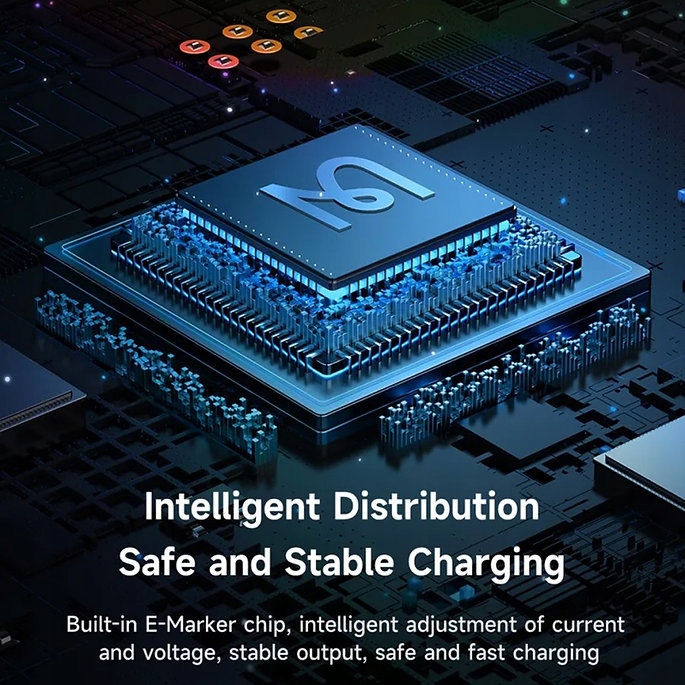 Wyposażony w chip E-Marker, kabel ten oferuje inteligentną regulację prądu i napięcia, co gwarantuje stabilne wyjście i bezpieczne ładowanie.