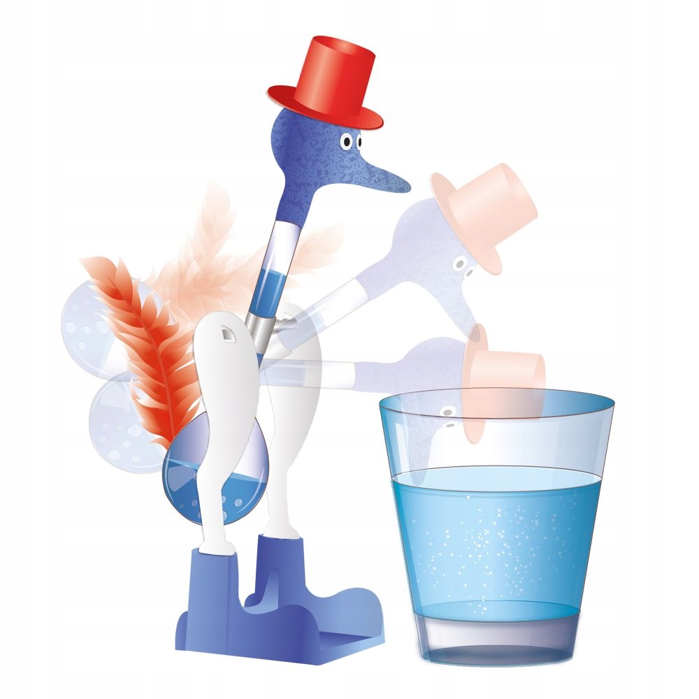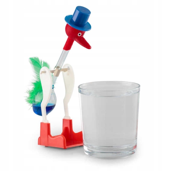 Gdy zamoczysz głowę tego zabawnego ptaka i postawisz go przed szklanką z wodą, niestrudzony ptak godzinami będzie zaglądał do szklanki by zamoczyć w niej swój dziób. Dostępny w czterech kolorach: niebieski, czerwony,zielony,żółty. Wysokość około 18cm