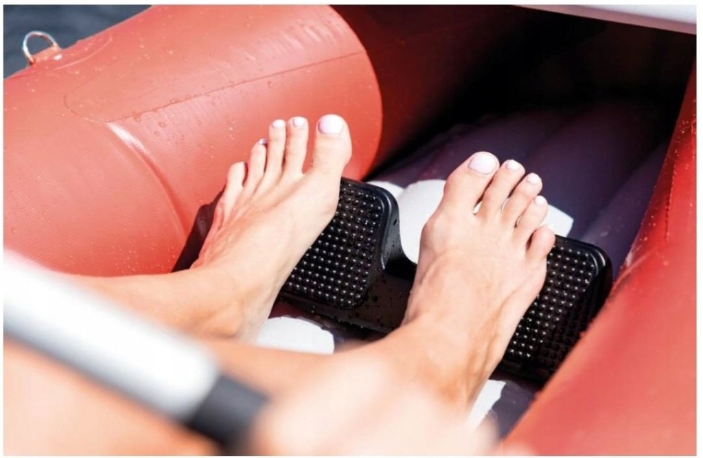 By wiosłowanie było efektowniejsze w dmuchanym kajaku umieszczono podnóżki.