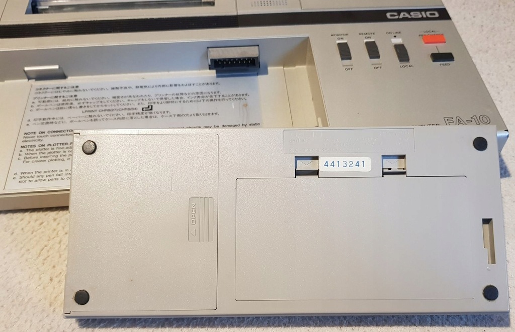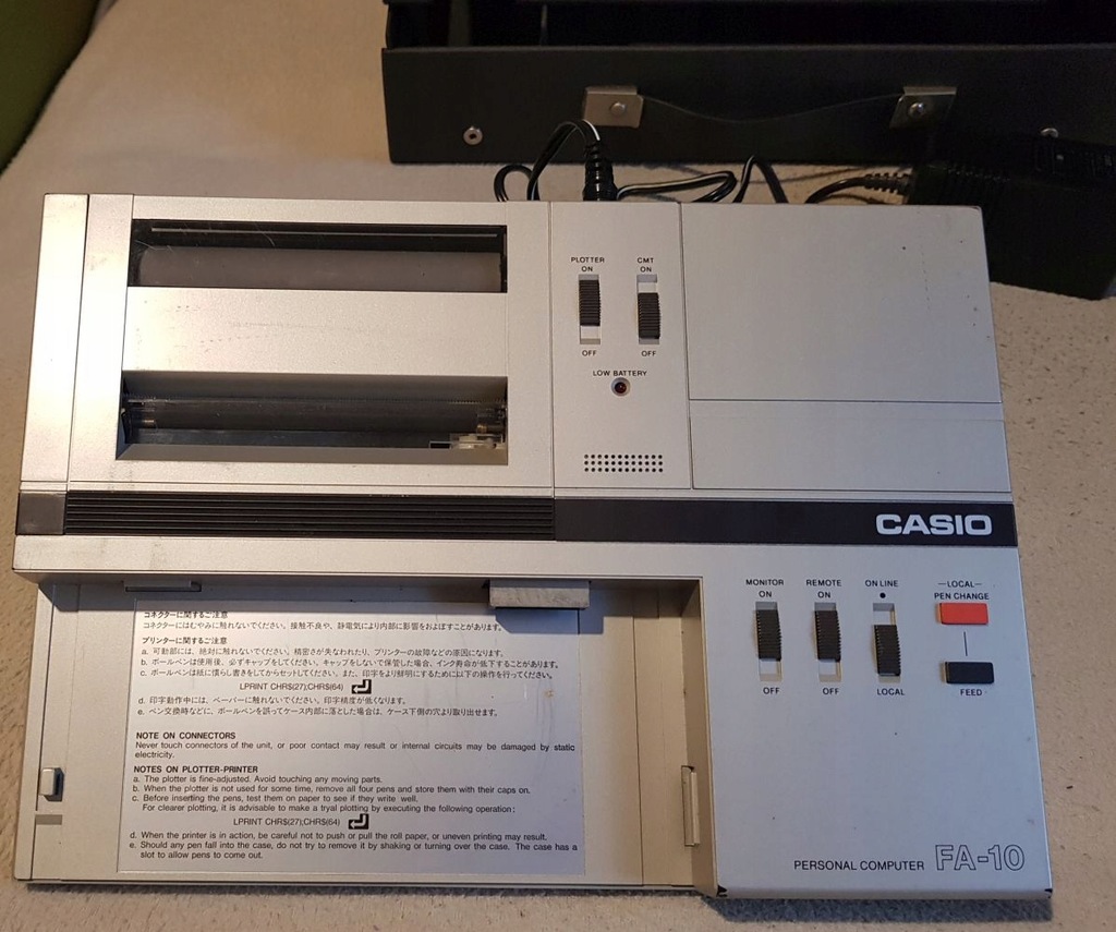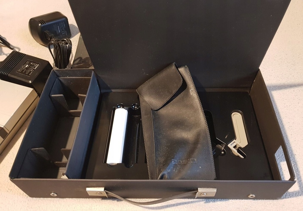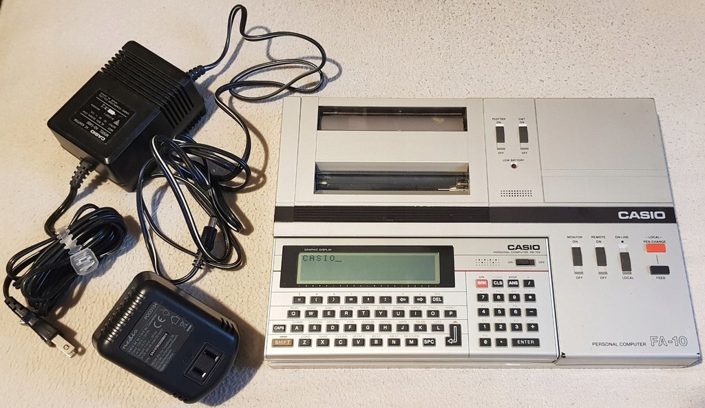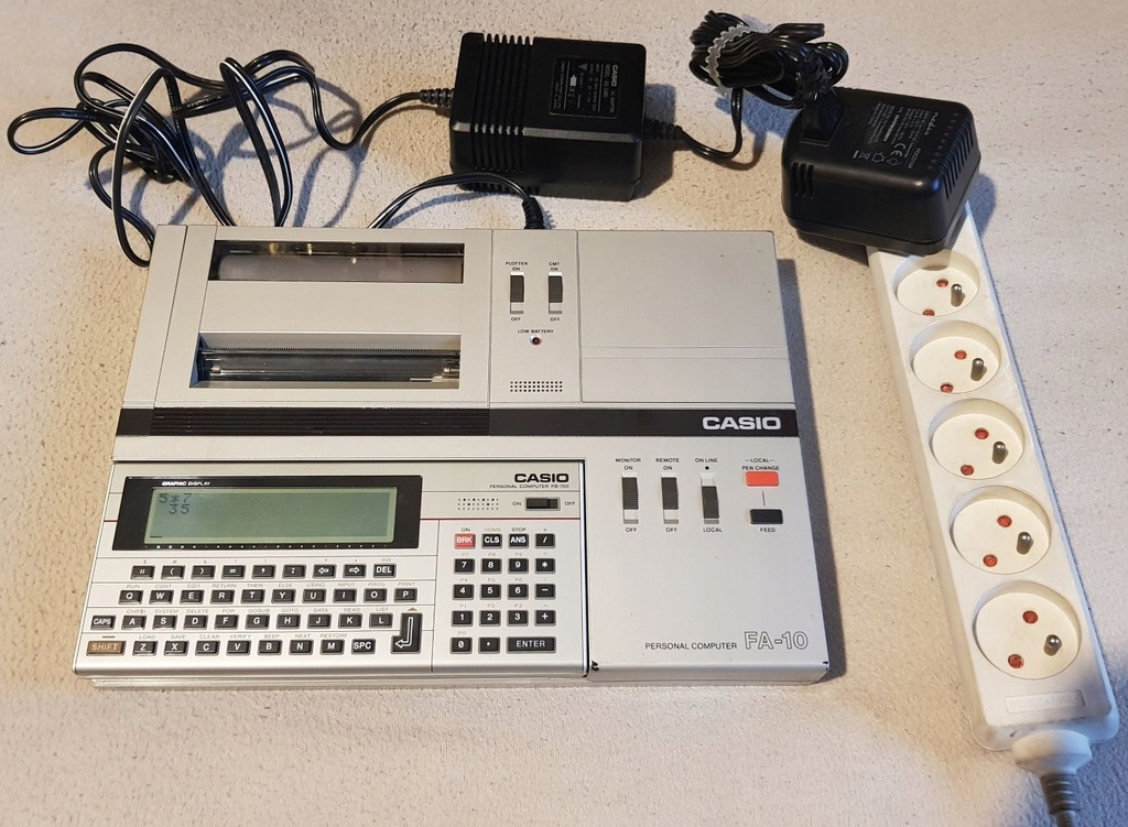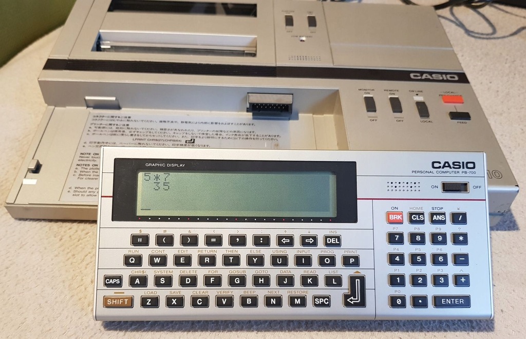 Oferuję kalkulator Casio PB-700 wraz ze stacją dokującą FA-10. Sprzęt jest oryginalny, sprowadzony bezpośrednio z Japonii. Sprzedaję cały zestaw widoczny na zdjęciu dodatkowo w komplecie z zasilaczem umożliwiającym podłączenie wszystkiego na nasze napięcie. Niestety nie jestem w stanie sprawdzić i nie do końca wiem jak go obsłużyć. Kalkulator włącza się normalnie i działa. W komplecie nowe baterie główne i mała podtrzymująca pamięć. Stacja dokująca włącza się, drukarka papier przewija. Nie wiem jednak jak drukować.
