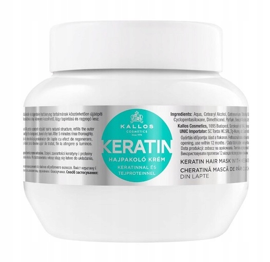 Kallos Keratin to profesjonalna maska do włosów, zaprojektowana z myślą o intensywnej regeneracji suchych, zniszczonych i łamliwych pasm. Dzięki zawartości keratyny i protein mleka, maska skutecznie odbudowuje strukturę włosów, przywracając im zdrowy wygląd, miękkość i naturalny blask. Jest to doskonałe rozwiązanie dla osób borykających się z osłabionymi, matowymi i zniszczonymi włosami.