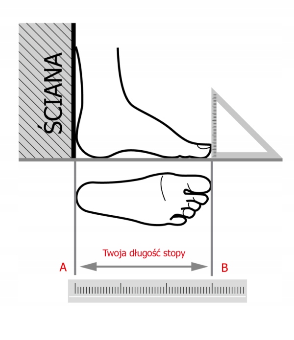 - 1. Aby prawidłowo dobrać rozmiar obuwia, należy zmierzyć długość swojej stopy. Sugeruj się zawsze pomiarem większej stopy.