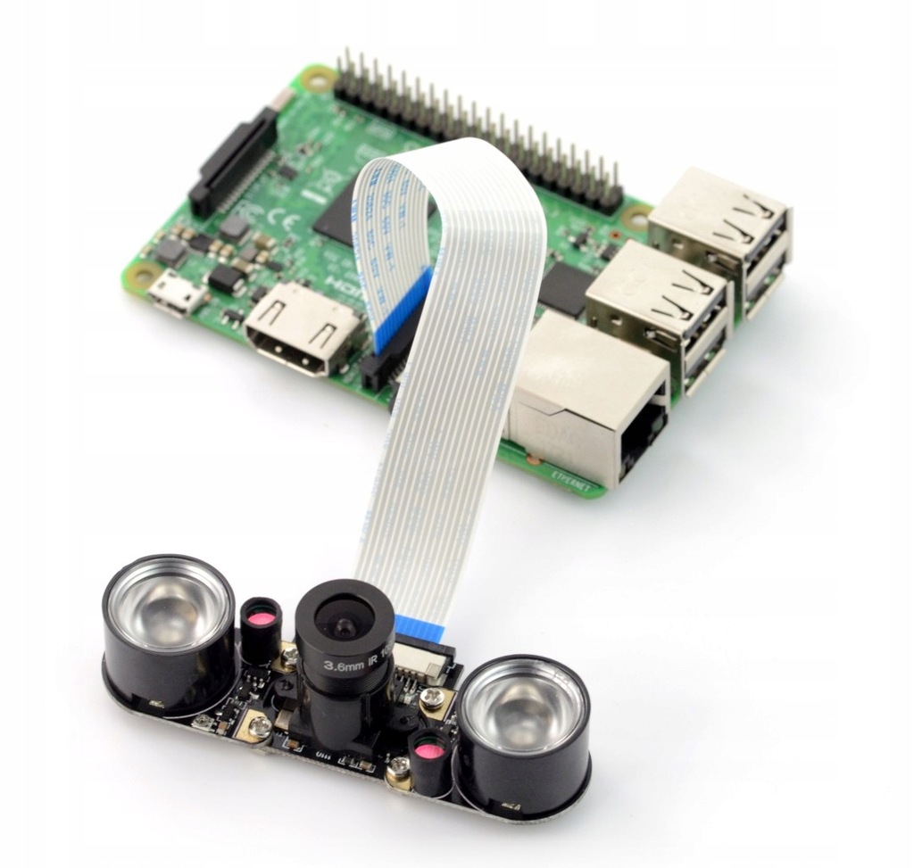 Moduł z kamerą podłączany do dedykowanego złącza minikomputera Raspberry Pi w wersji 3, 2, B+, A+ oraz starszych A i B. Urządzenie posiada matrycę CCD 1/4 " o rozdzielczości 5 Mpx, wspiera tryb HD 1080px. Dzięki dołączonym do zestawu modułom IR o mocy 1 W umożliwia nagrywanie w nocy.